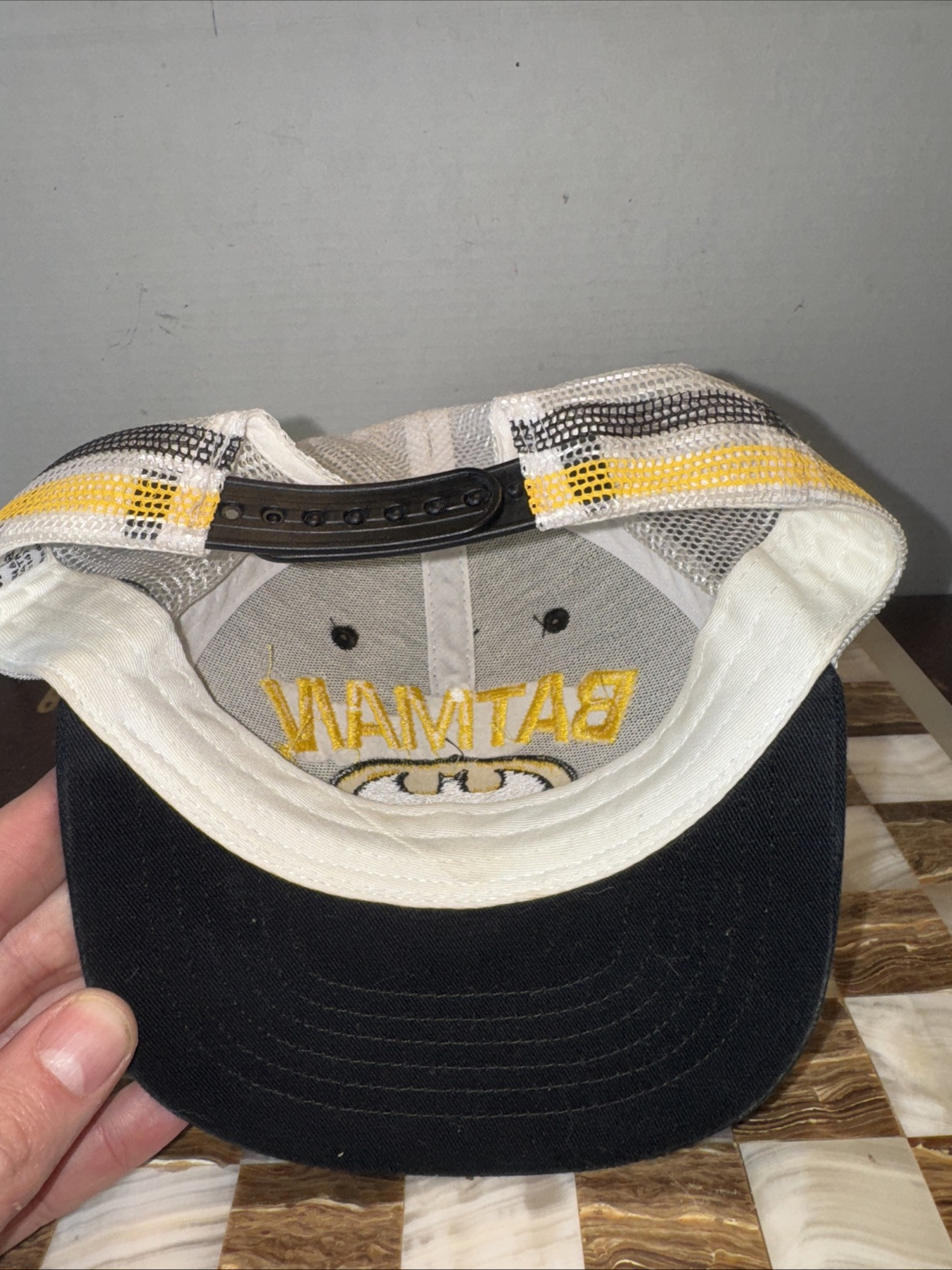 как выглядит Vintage BATMAN Six Flags 3 Stripe SnapBack Mesh Hat Youth Adjustable фото