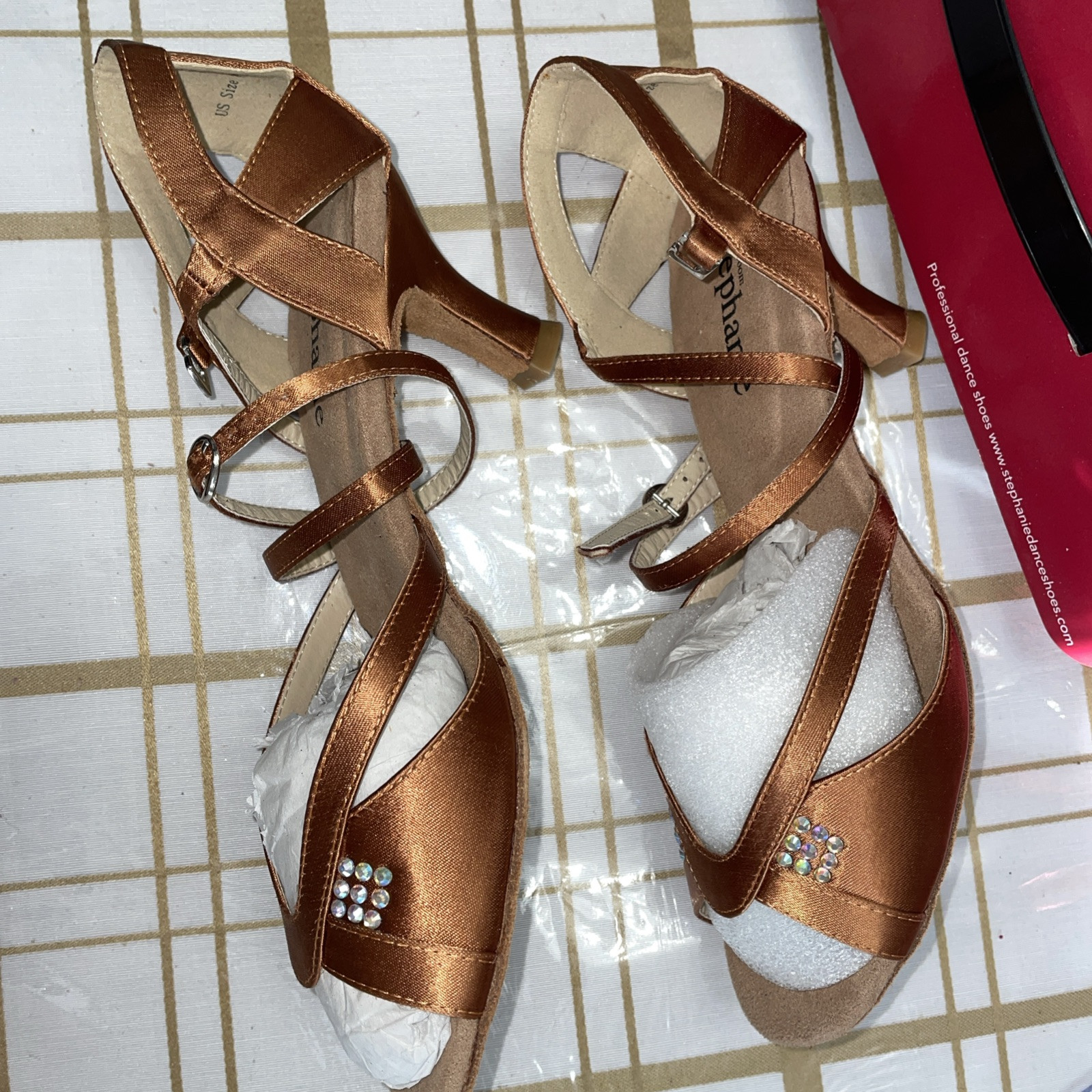 как выглядит Stephanie Latin Ballroom Dance Dark Tan Satin Rhinestone Shoes US 8,5 Heel 2 фото