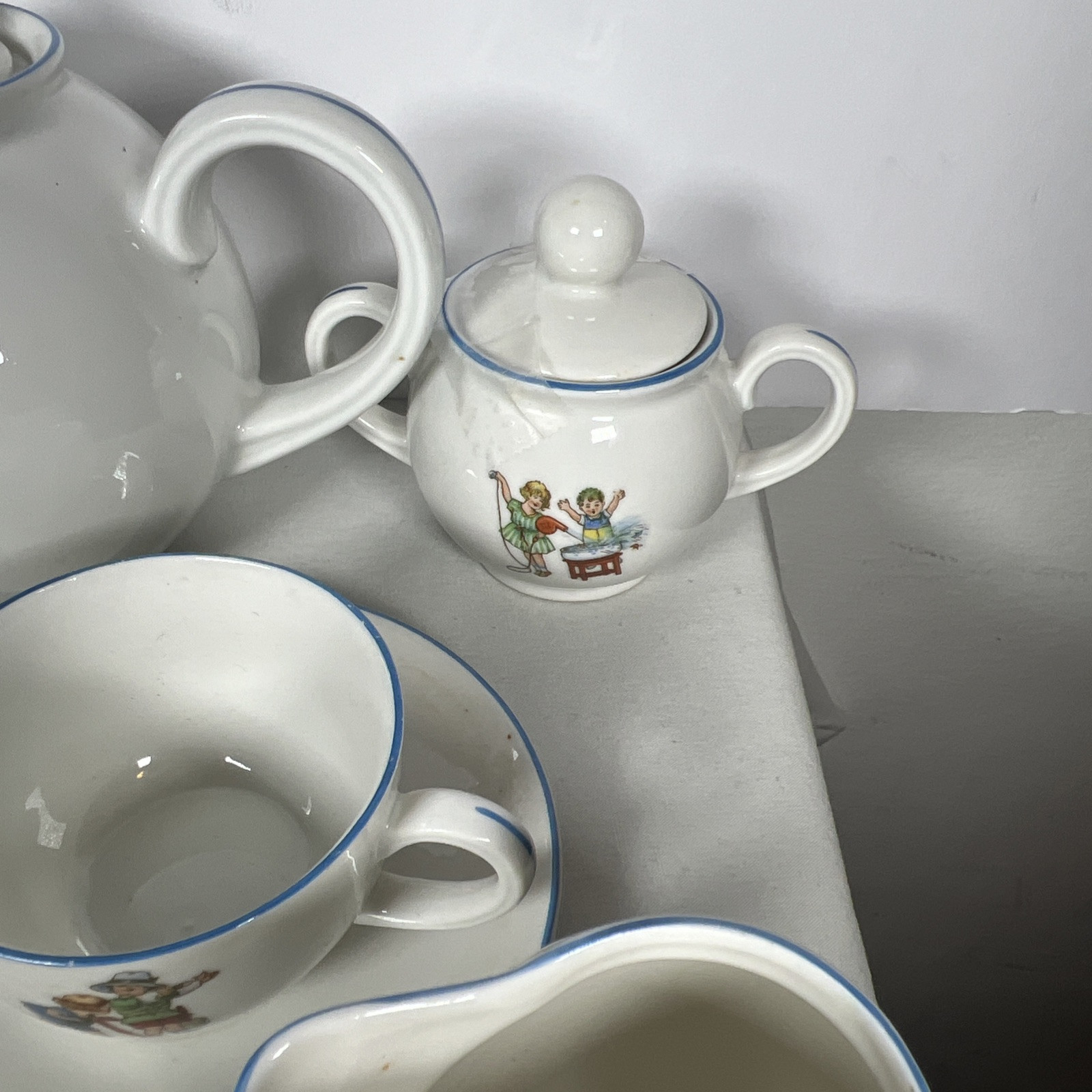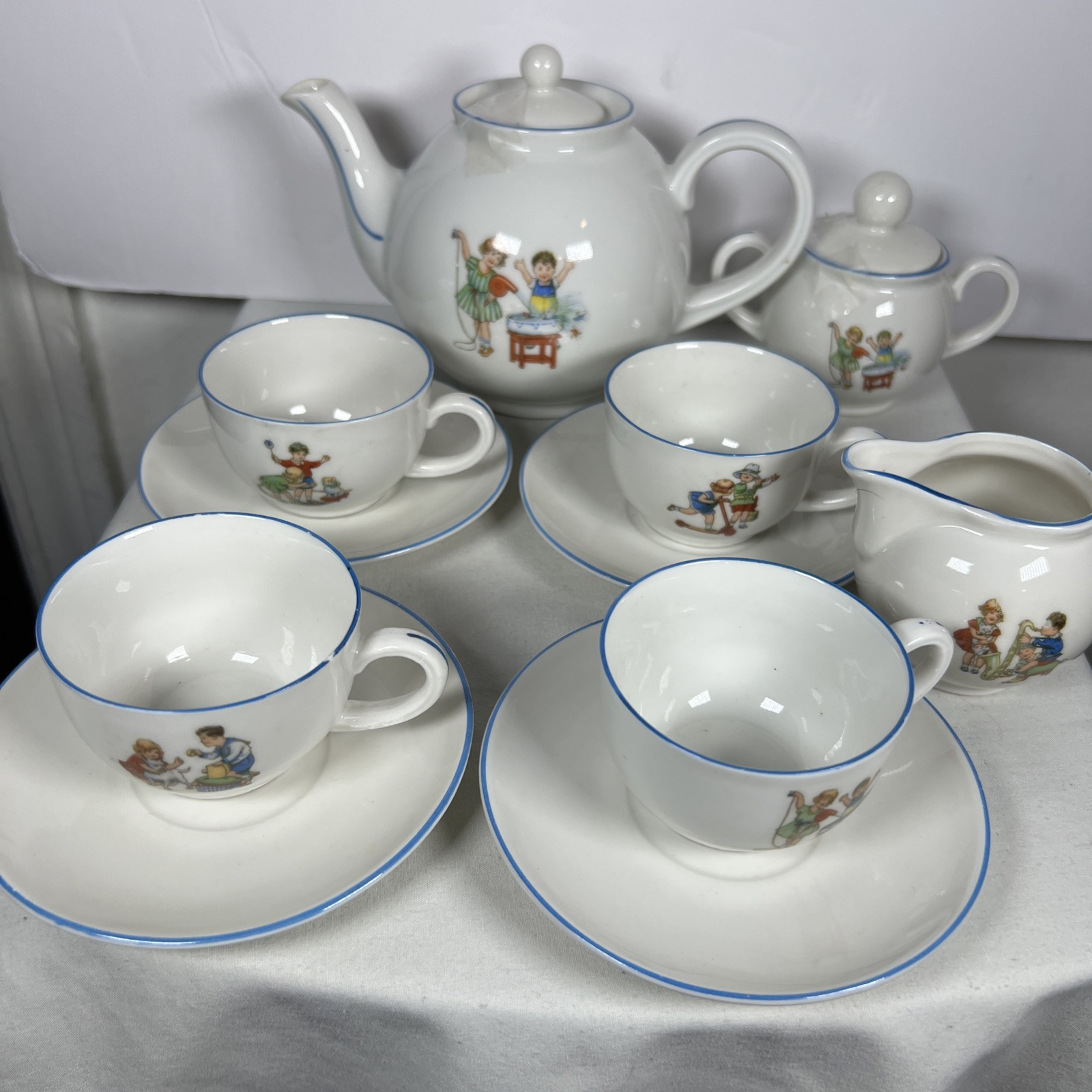 Vintage Childrens Tea Cup Set 4 Cups Saucers Kettle Sugar Milk Great Cond.