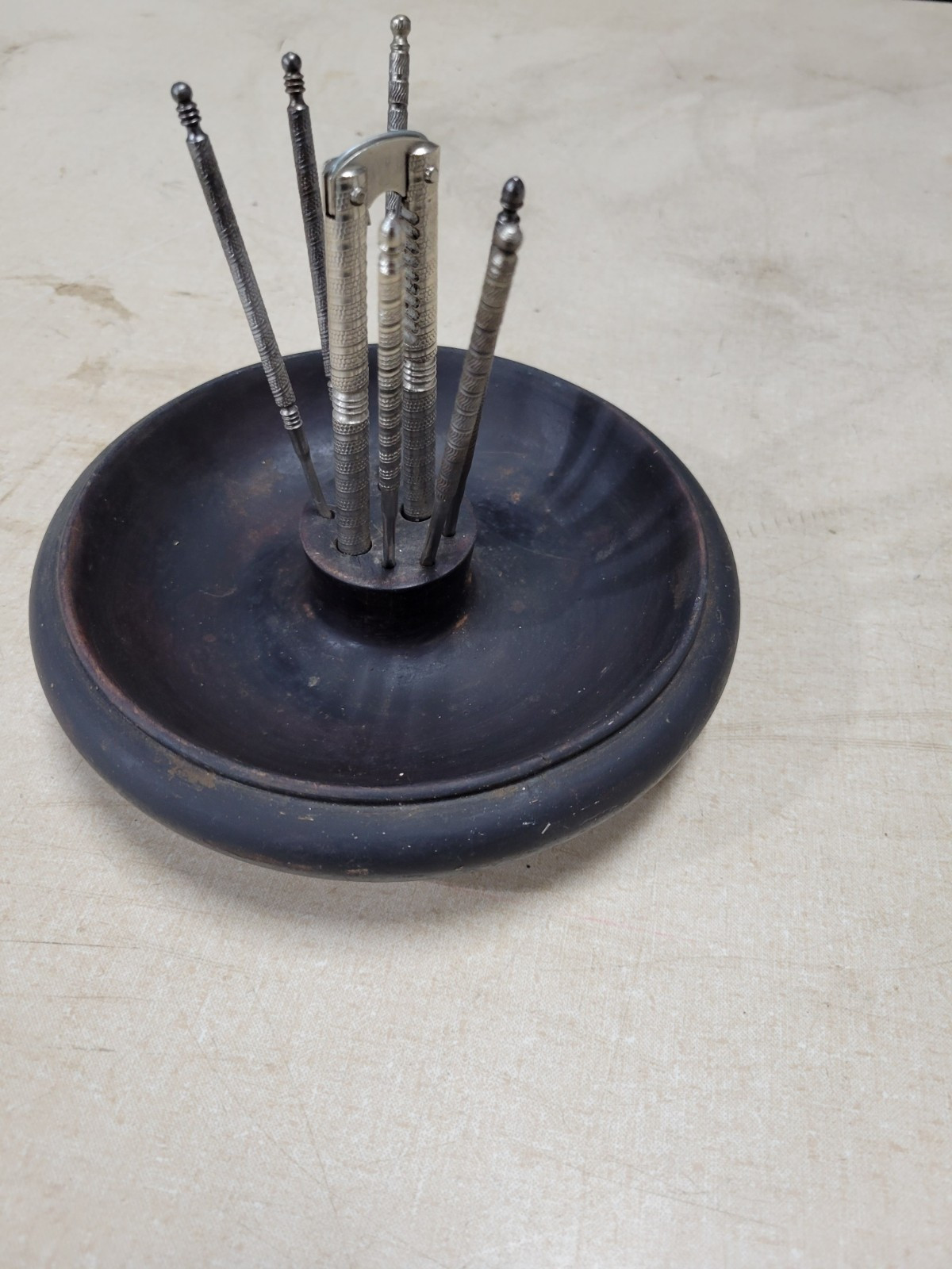 Vintage Turned Dark Wood Nut Bowl w/ Nut Cracker and 6 Nut Picks Set