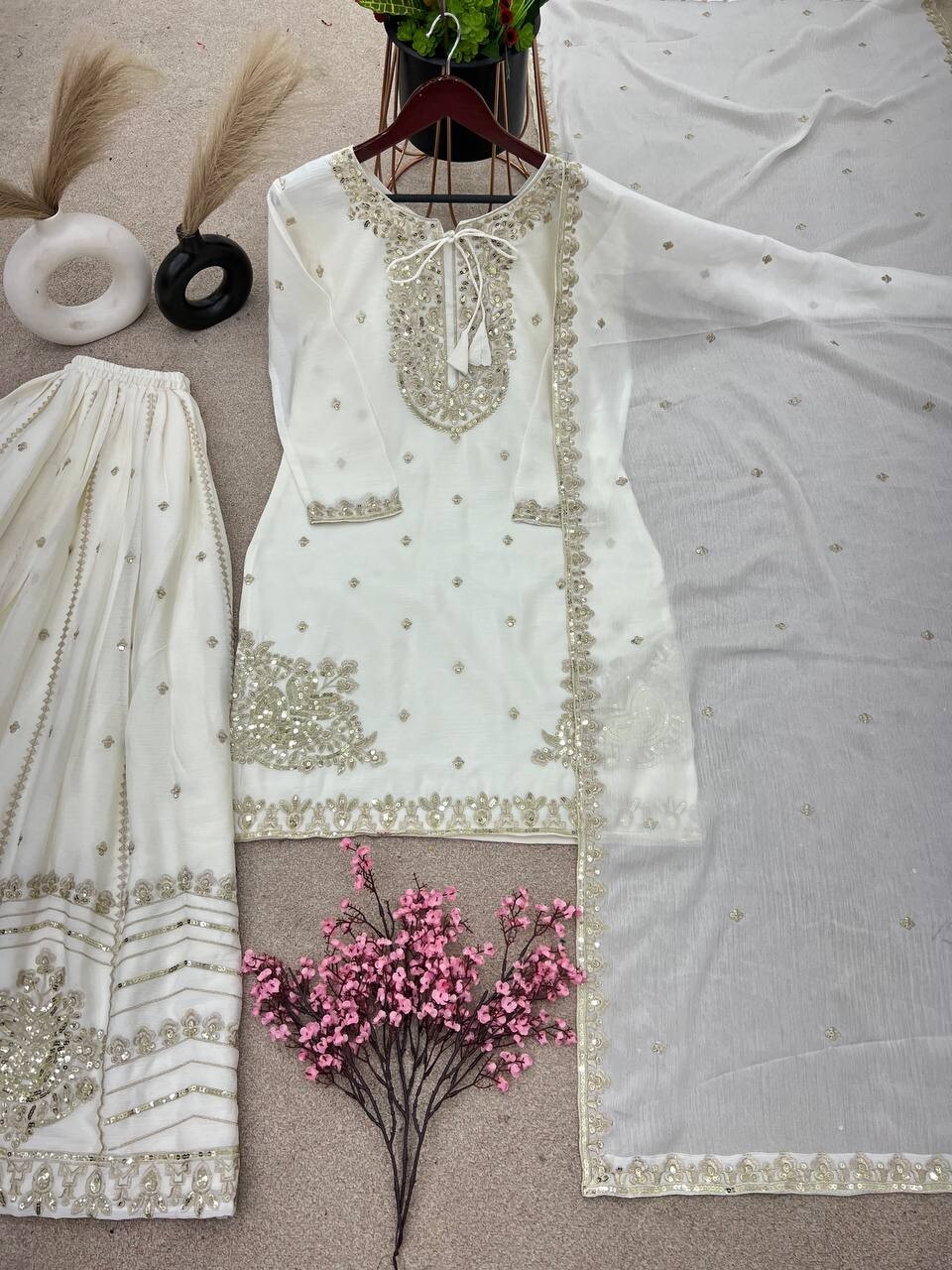 Premium Chinon Silk Kurta Palazzo Dupatta Set Women Wear Readymade Salwar Kameez
