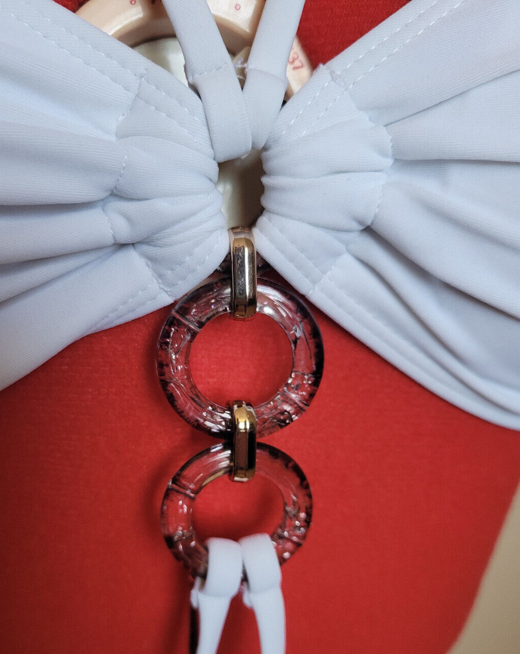 как выглядит White Blue/Gold Rings Halter String Tie Removeable Pads Bikini Swimsuit Top S фото
