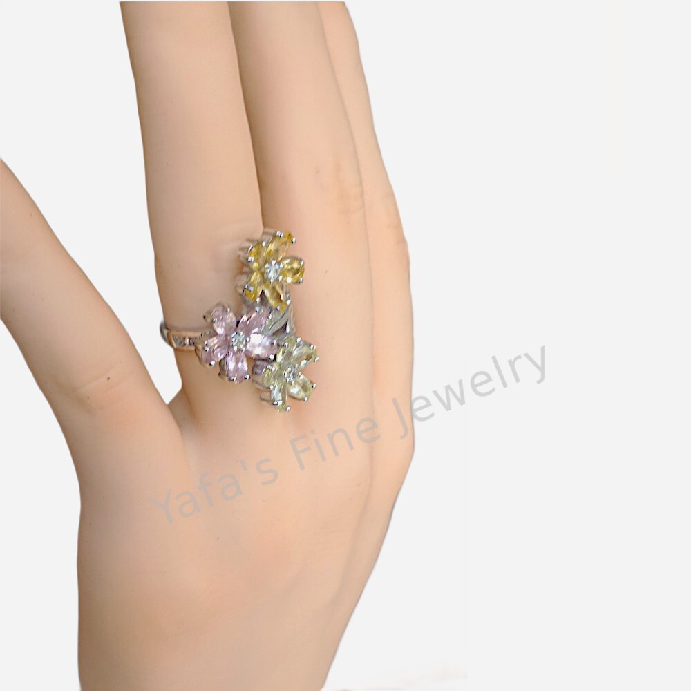 Flower Ring Multi-Colorful Floral Petals Sterling Silver Rhodium Plated Size 6