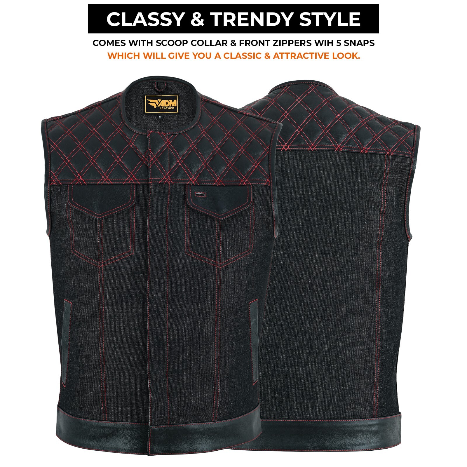 Men s SOA Leather and Denim Biker Vest Club Style No Collar Concealed Carry
