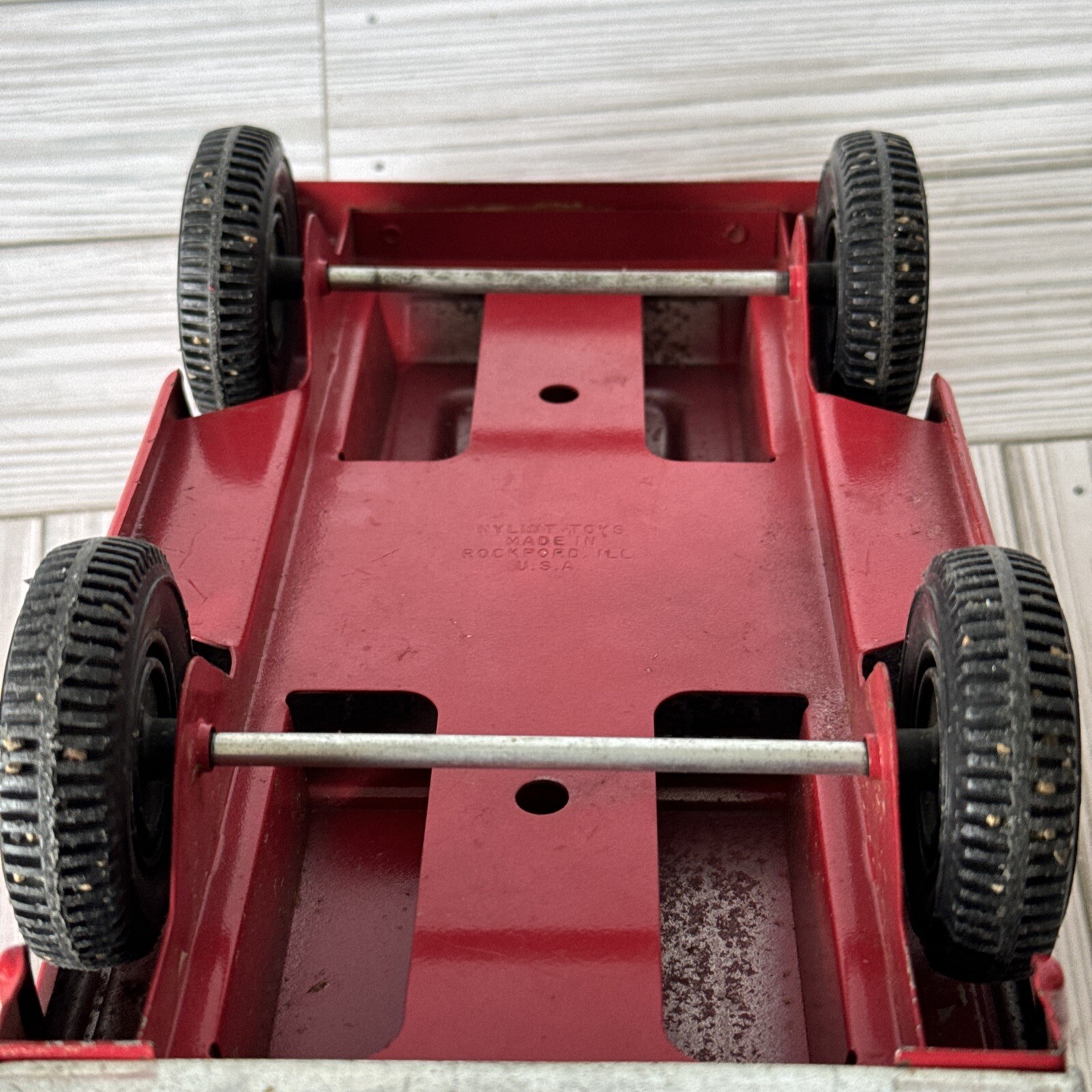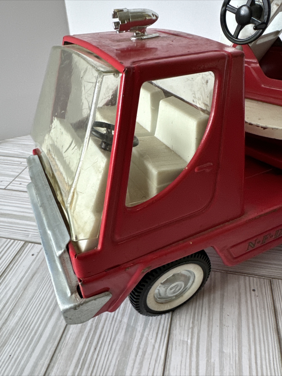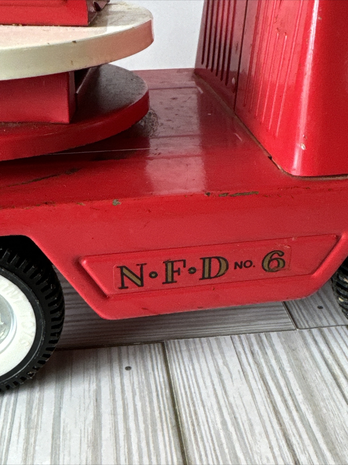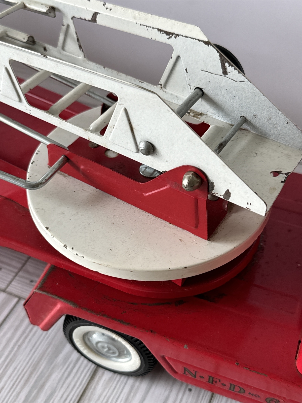 как выглядит Vintage NYLINT Fire Department NFD 6 Aerial Ladder Pressed Steel Truck 30 фото