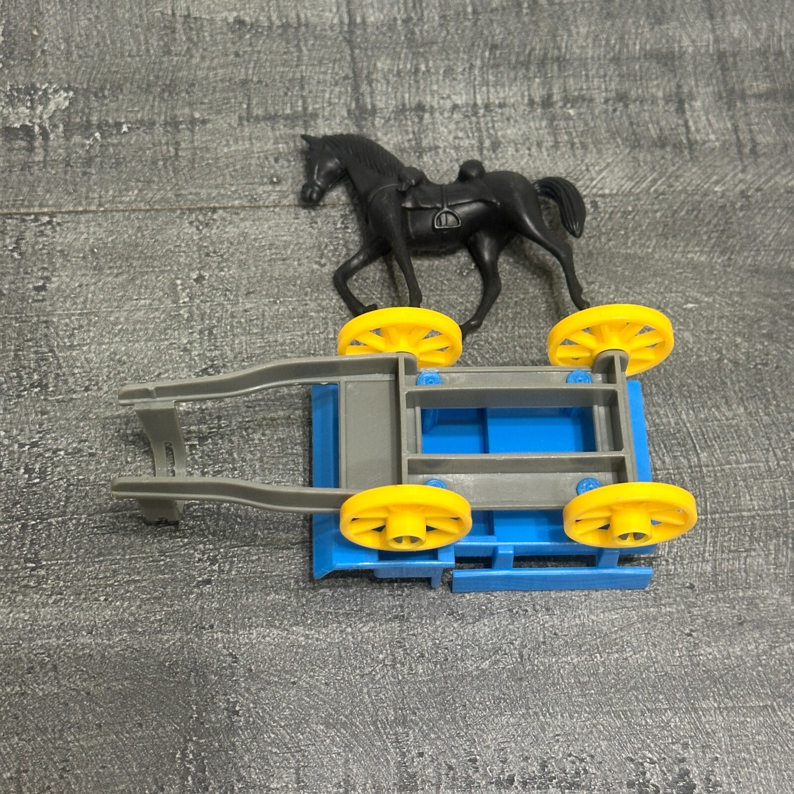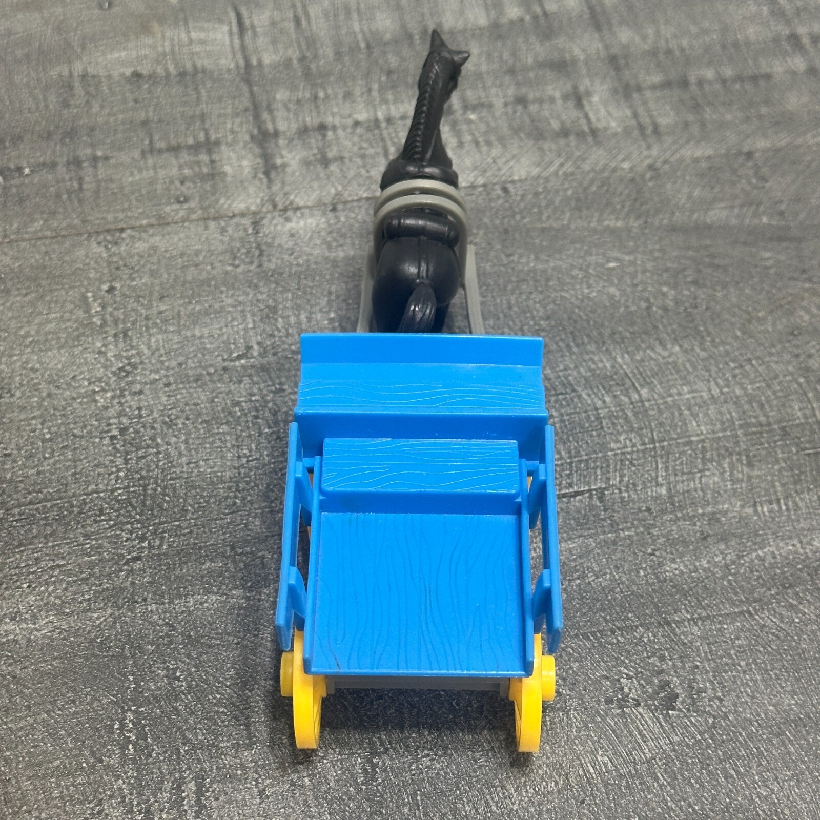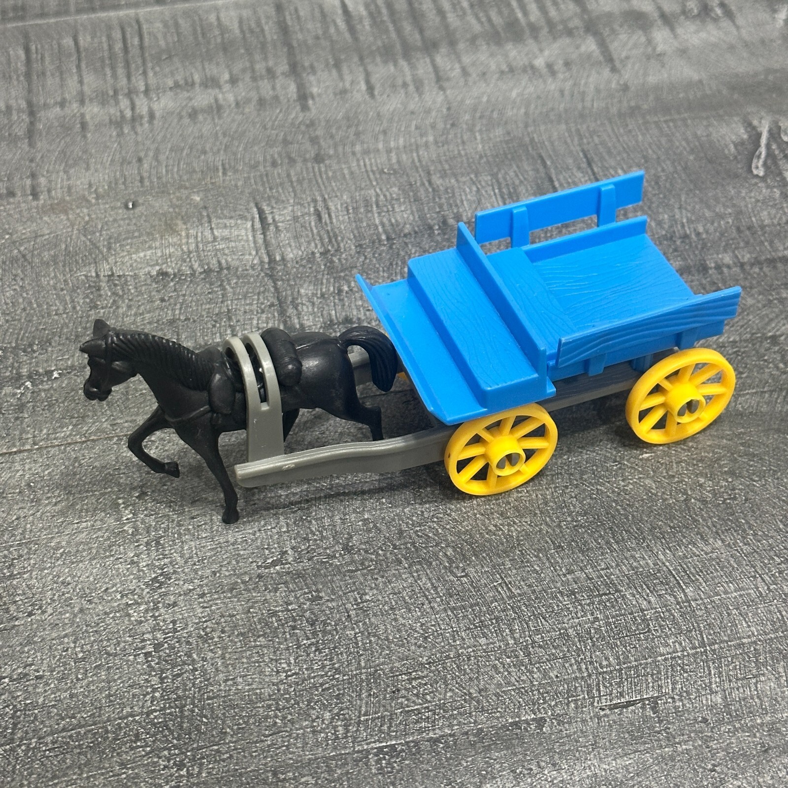 Vintage Horse Drawn Blue Wagon Yellow Wheels w/Black Horse Plastic Toy