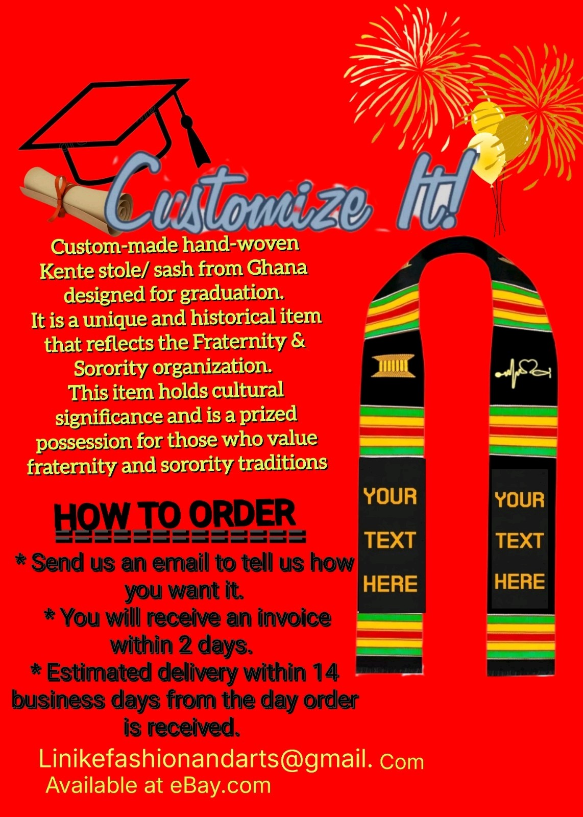 • Ghana Customize hand woven Kente Stole/black/Sash Graduation/church/Usher,Clegy