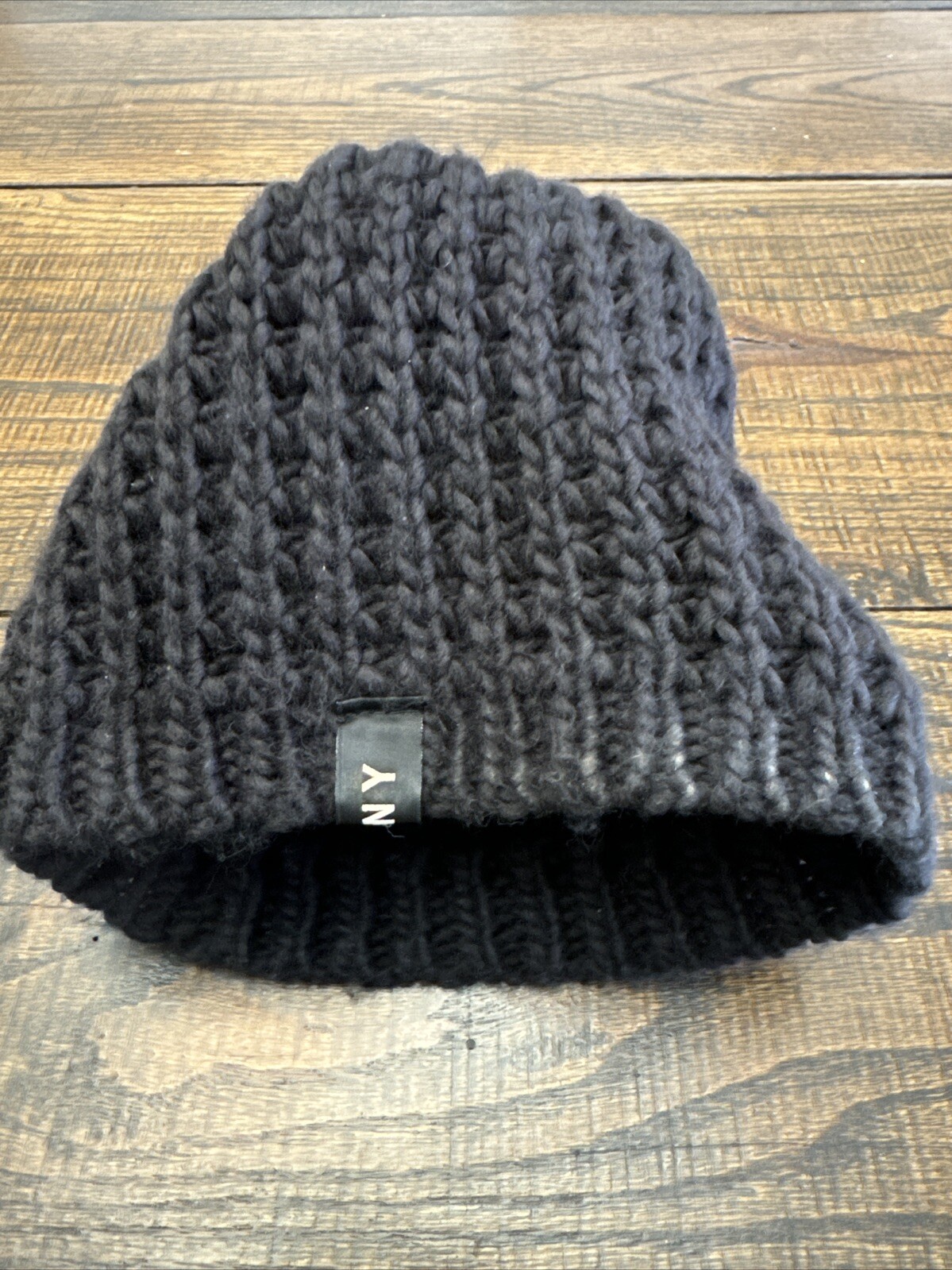 как выглядит DKNY Women s Beanie Acrylic Black Knit Faux Fur Pom Pom, One Size Fits Most фото