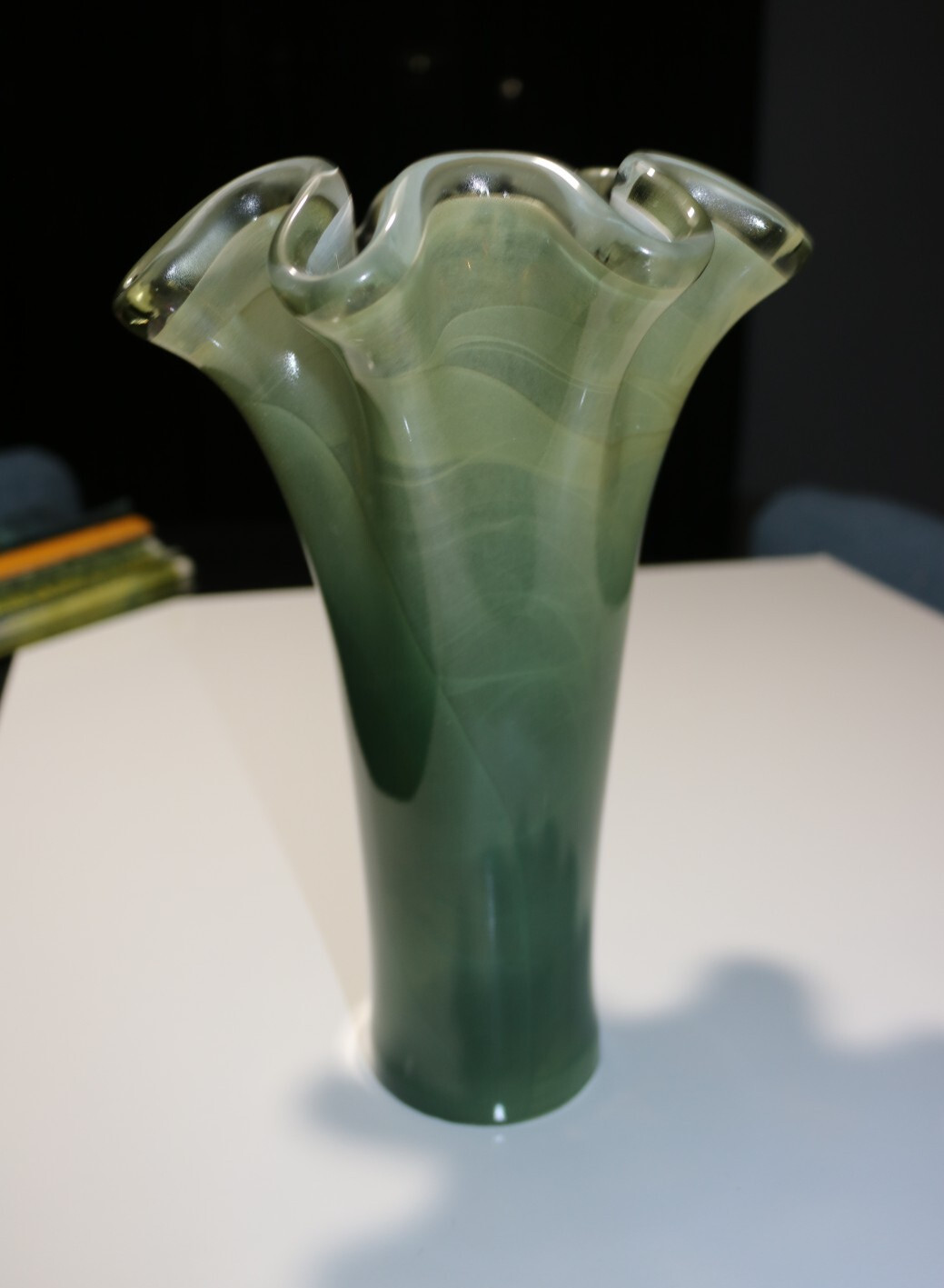Murano Green Glass Vase with Ruffled Top 10.5