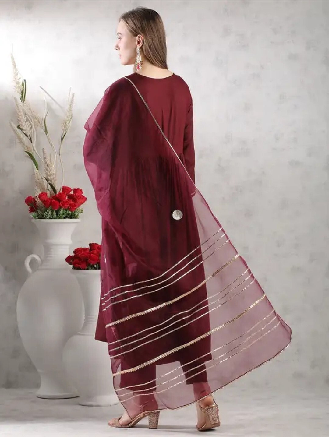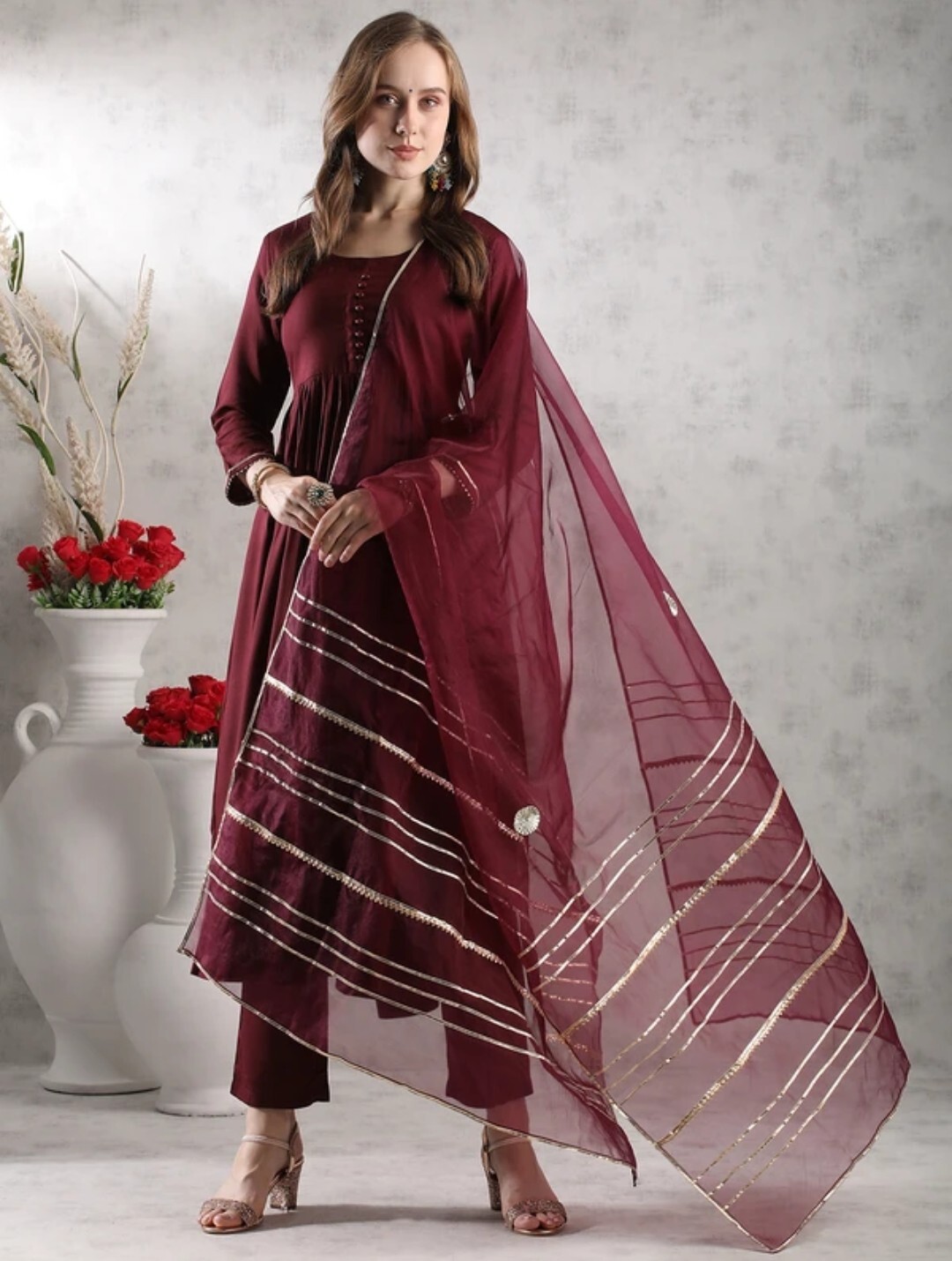 Women Traditional wear;Maroon Ethnic Gotta Patti Solid Cotton Anarkali Kurta Set