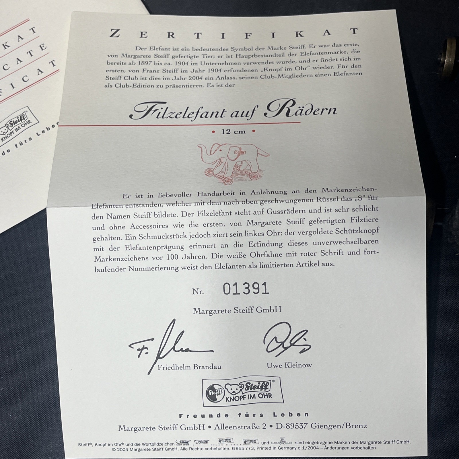 • Steiff Felt Elephant On Wheels FILZELEFANT 2004 Club Edition With Box/COA