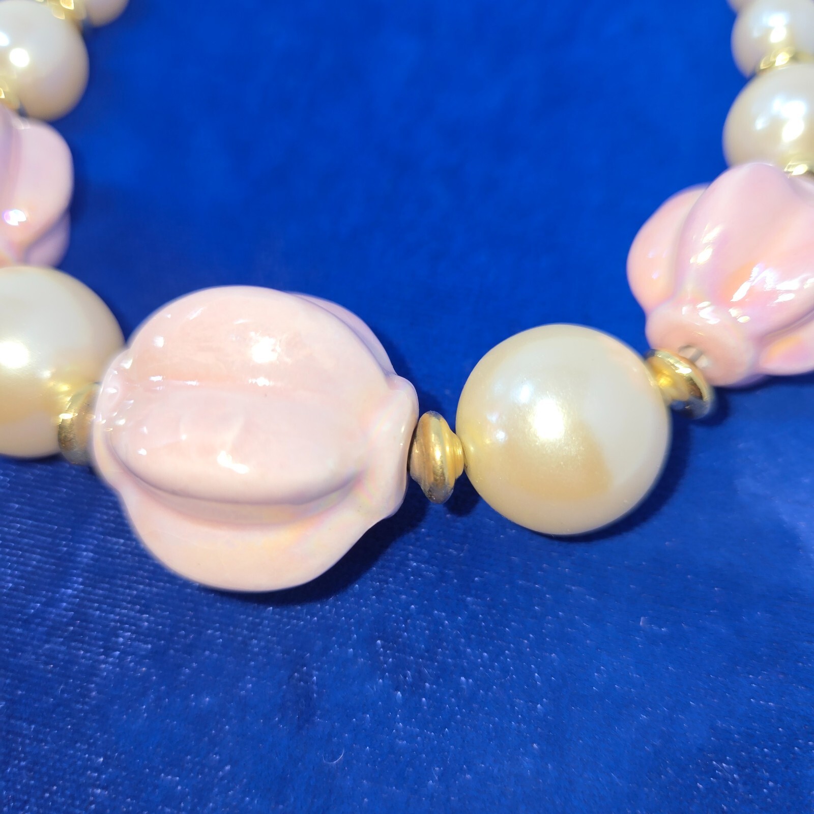 Porcelain Bead Faux Pearl Statement Bib Choker White Pink Gold 18 Japanese