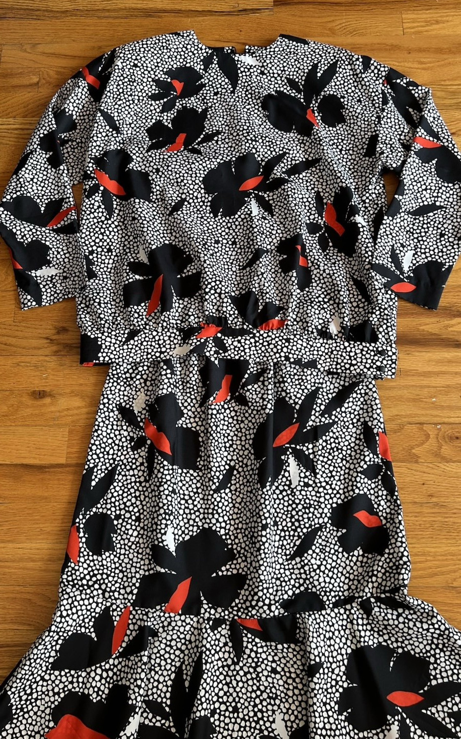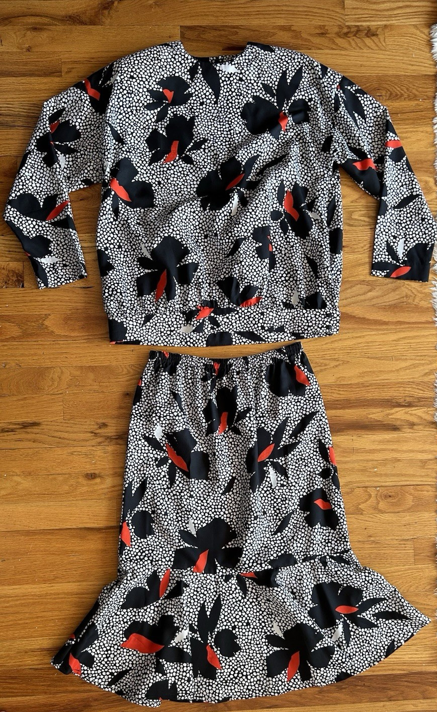как выглядит VTG 80s Matching Set Blouse Skirt Red / Blk Sz S/M Floral Print Shoulder Pads фото