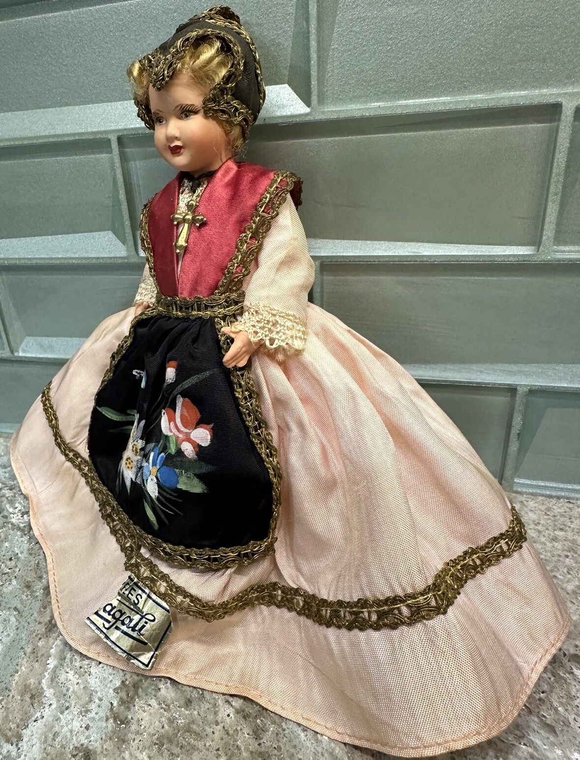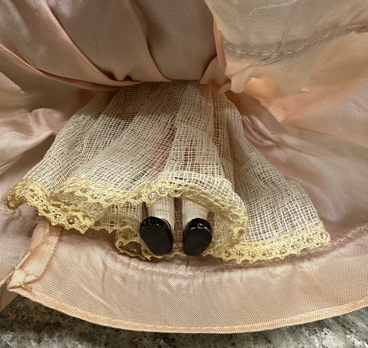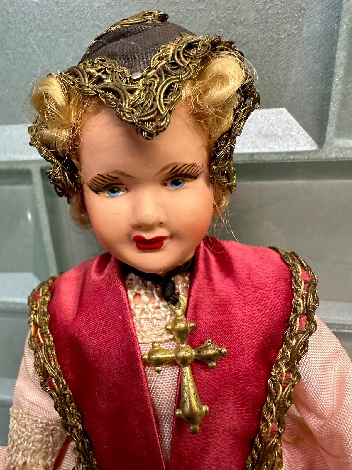 как выглядит Vtg French Celluloid 8 Jointed Doll Taffeta Gown With Cross Handpainted Apron фото