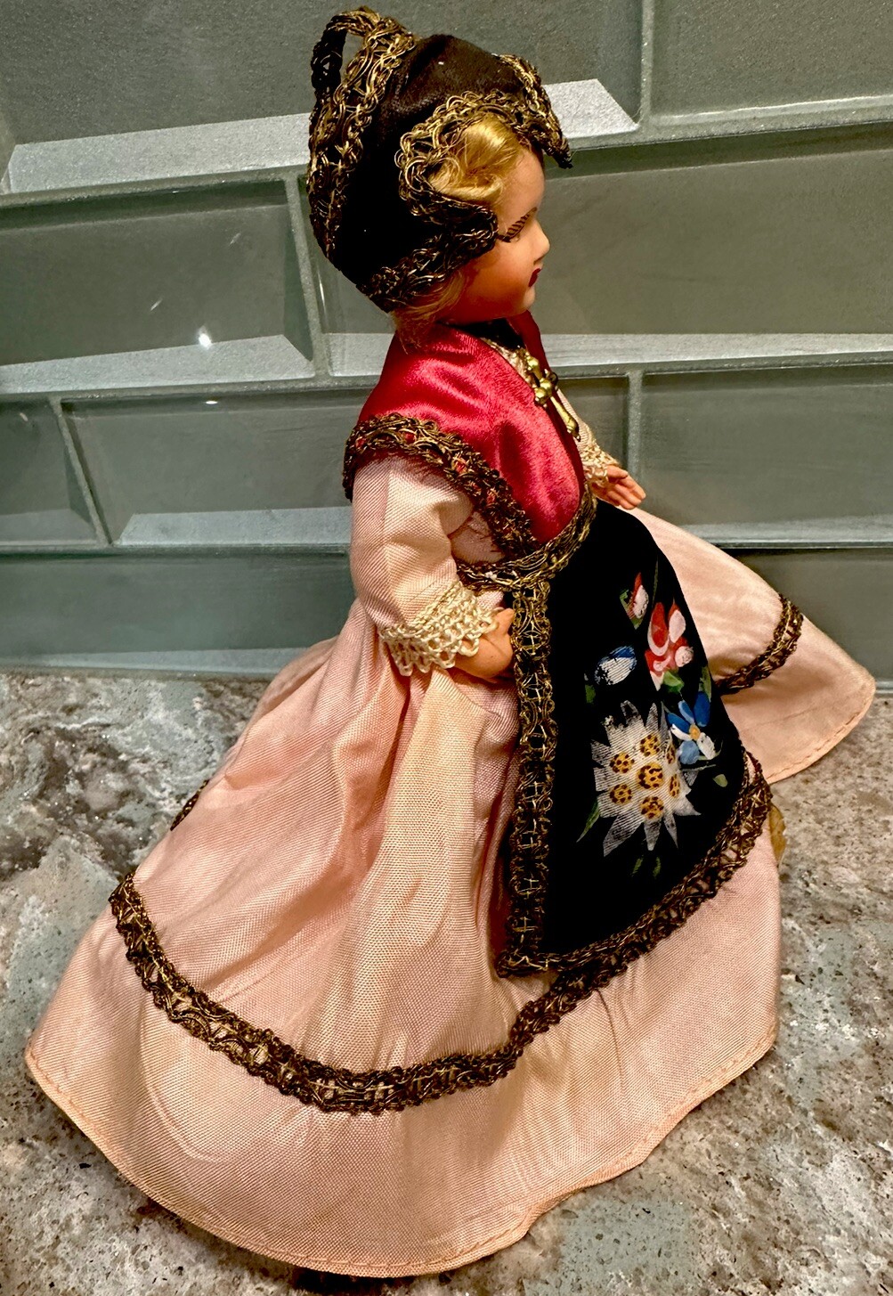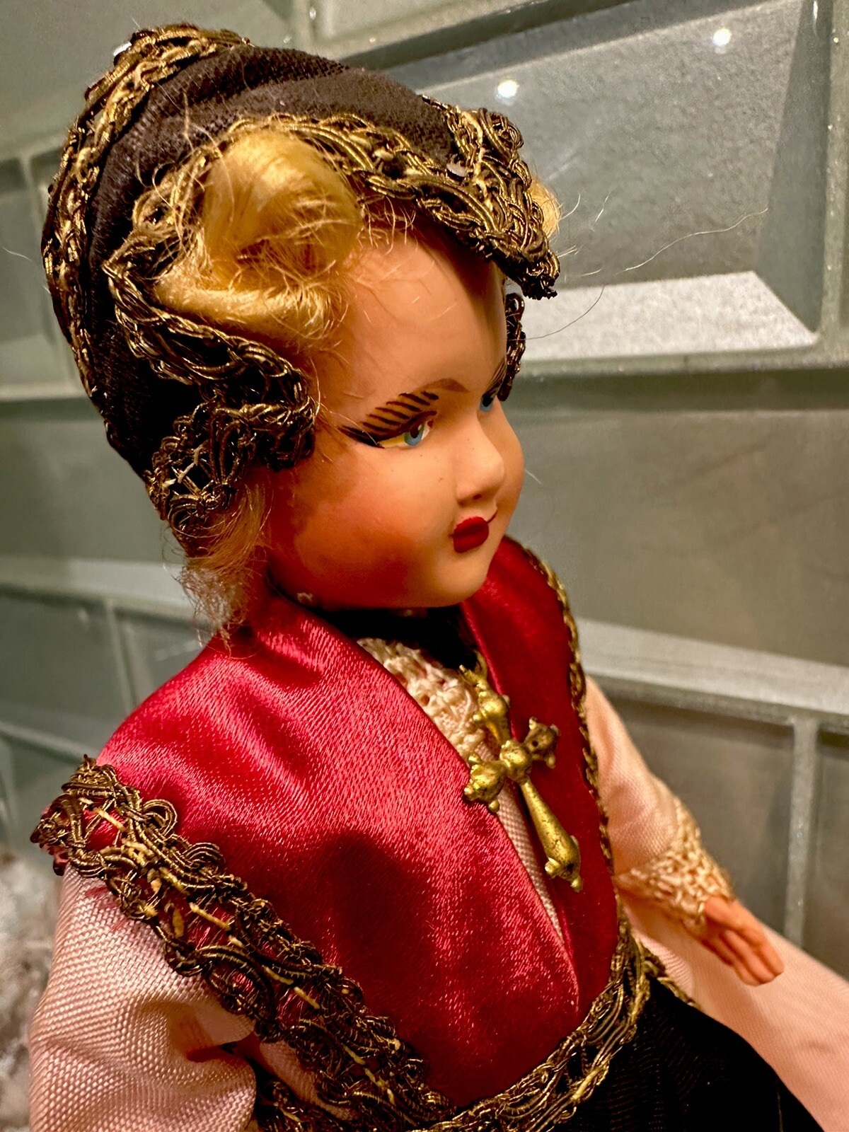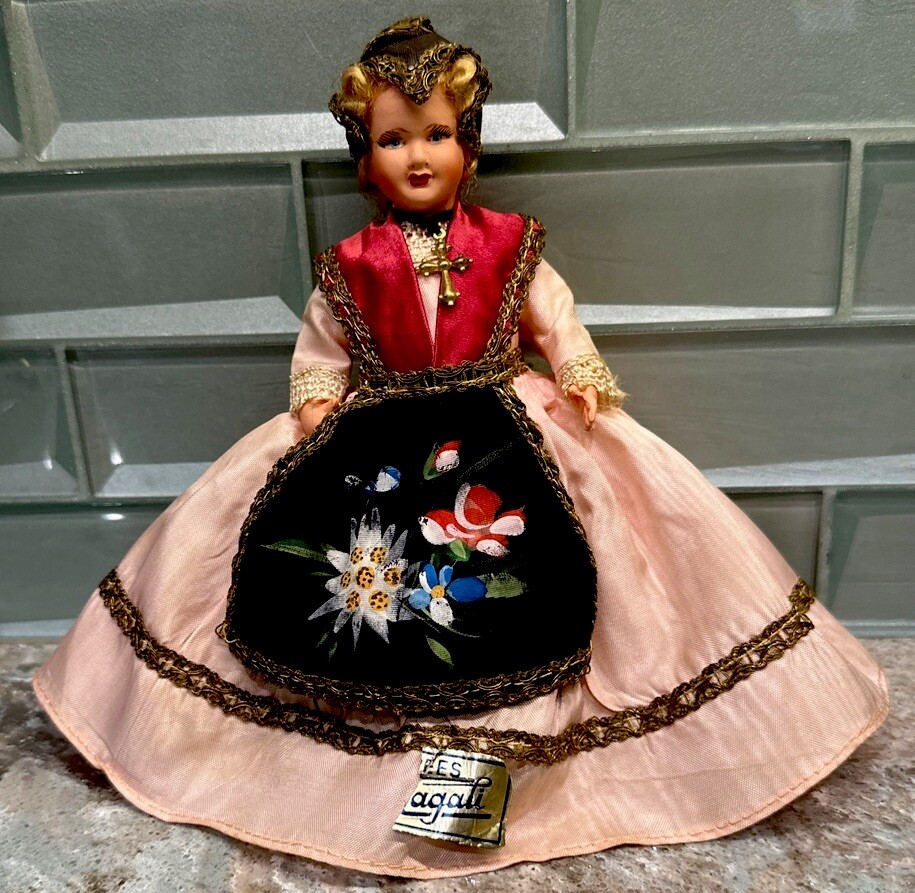 как выглядит Vtg French Celluloid 8 Jointed Doll Taffeta Gown With Cross Handpainted Apron фото