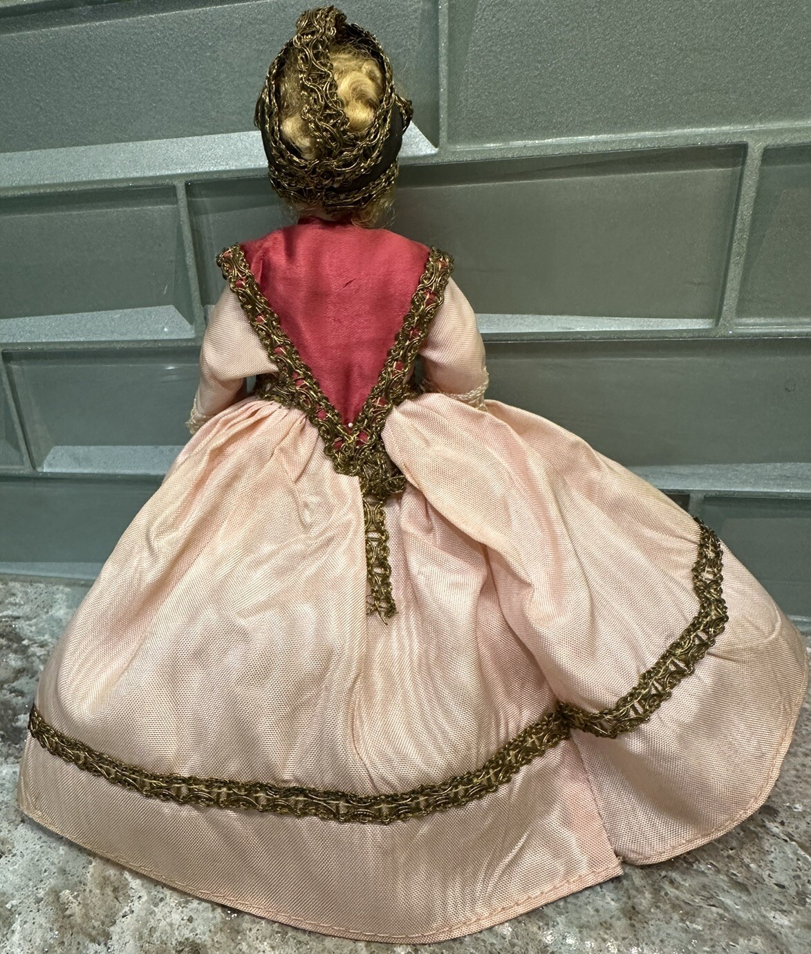Vtg French Celluloid 8 Jointed Doll Taffeta Gown With Cross Handpainted Apron