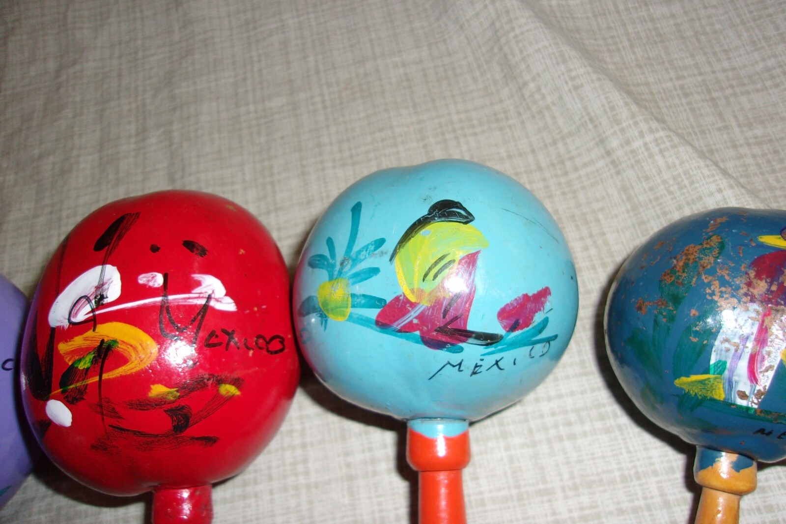 как выглядит Vtg Mexican Maracas Wooden Handles Hand Painted Gourds Musical Instrument Shaker фото