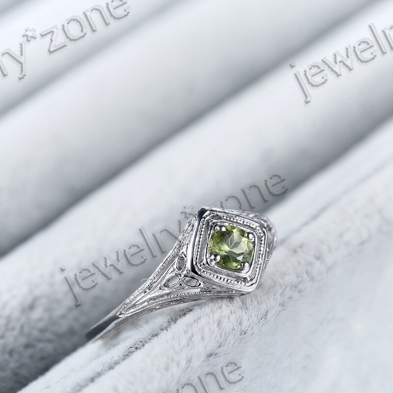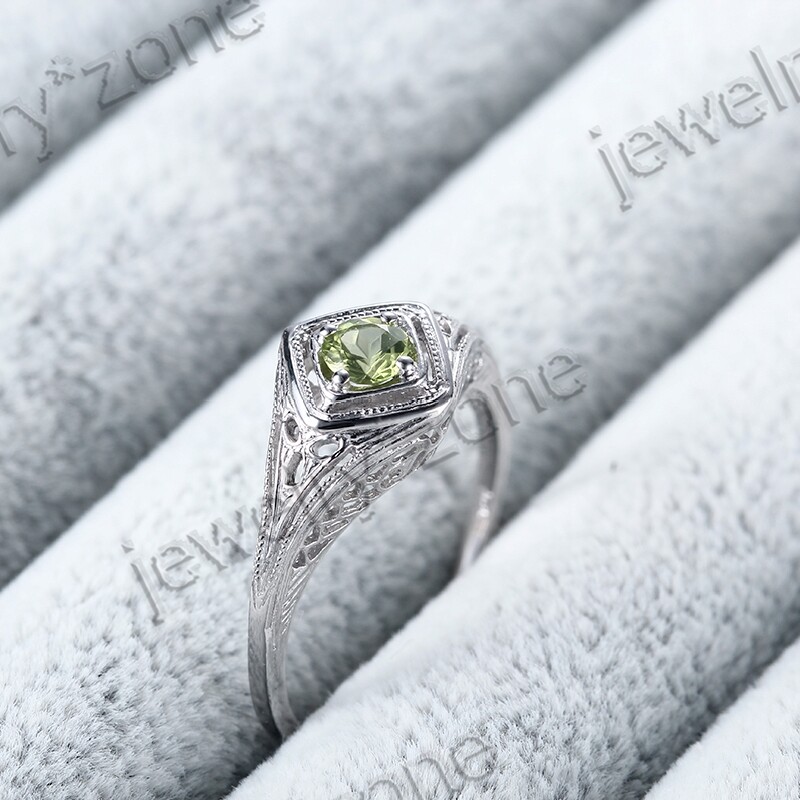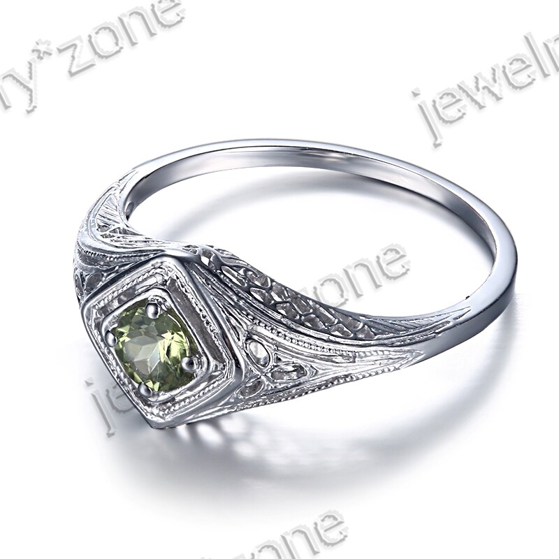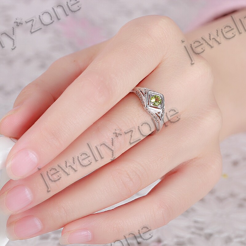 Sterling Silver 4mm Round Genuine Peridot Antique Engagement Gemstone Ring Gift