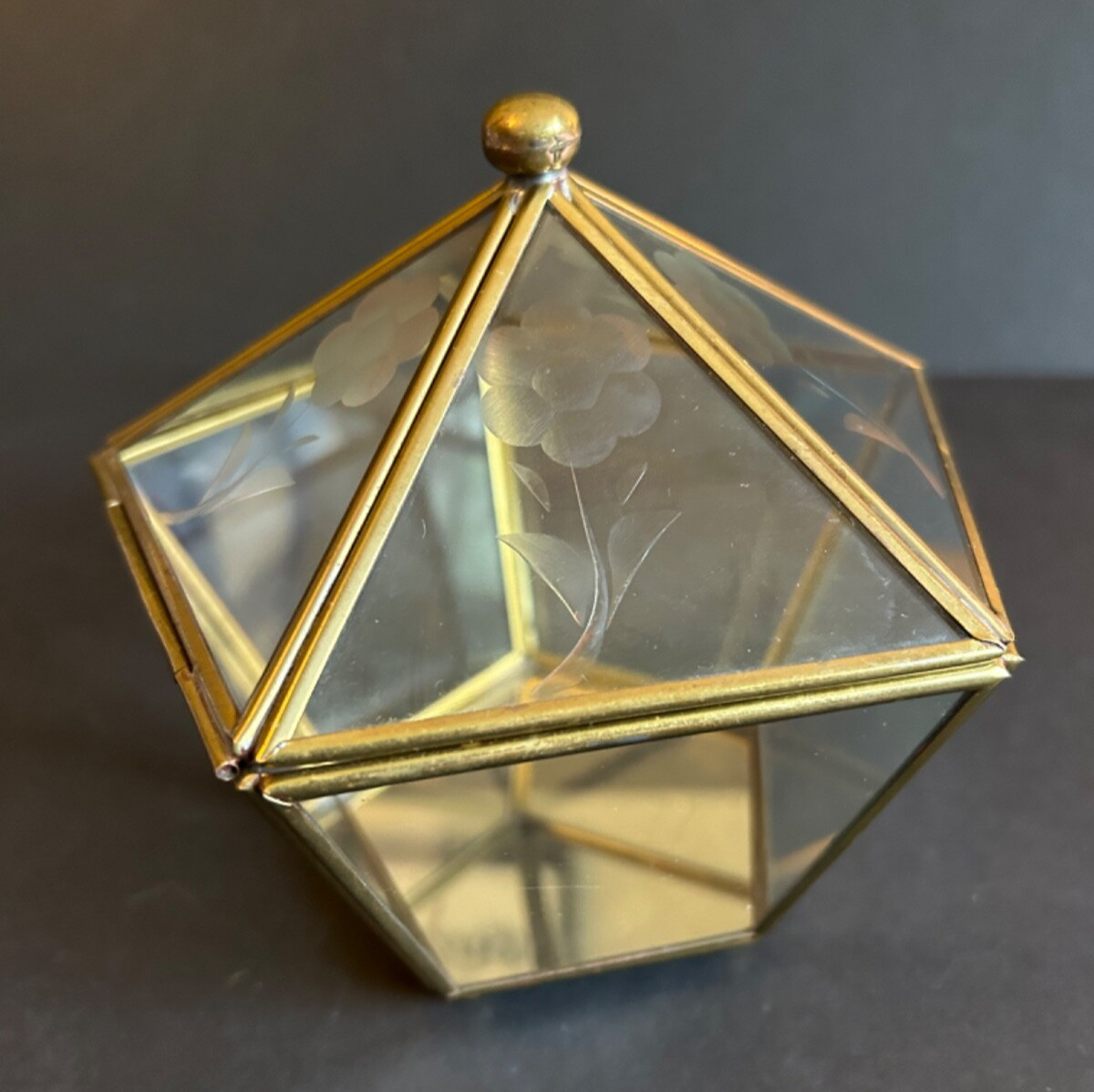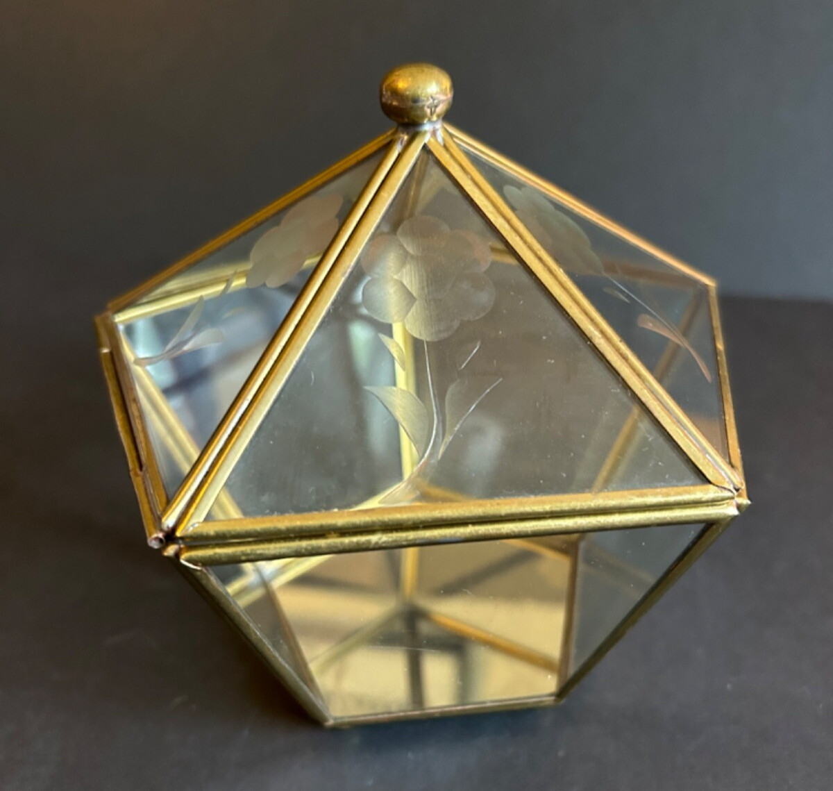 Vtg Brass Floral Etched Glass Jewelry Trinket Box Hinged Lid Mirrored Ball Feet