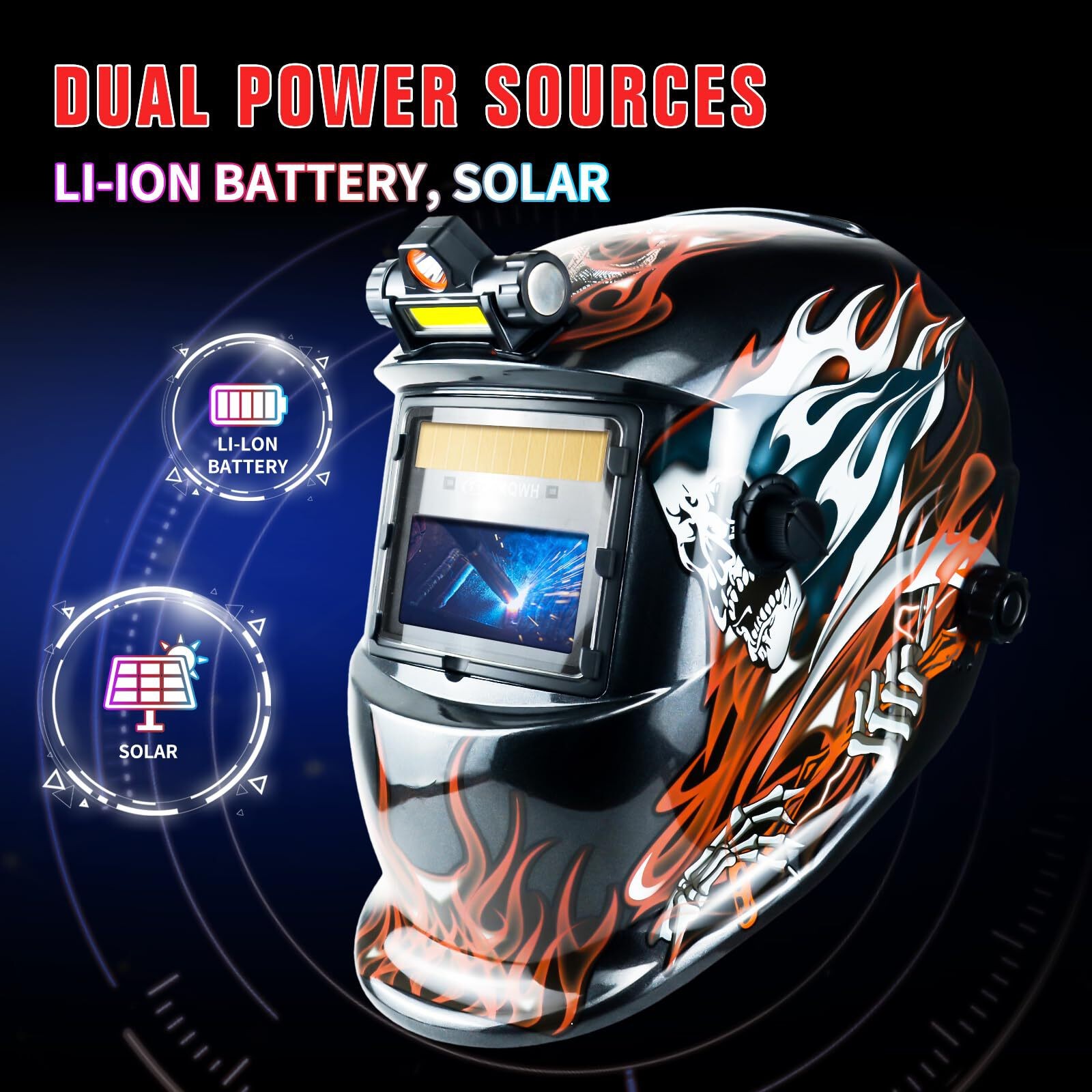 Welding Helmet for MIG/TIG/ARC, Wide Shade 9-13 2 Arc Sensors, Flaming Skull