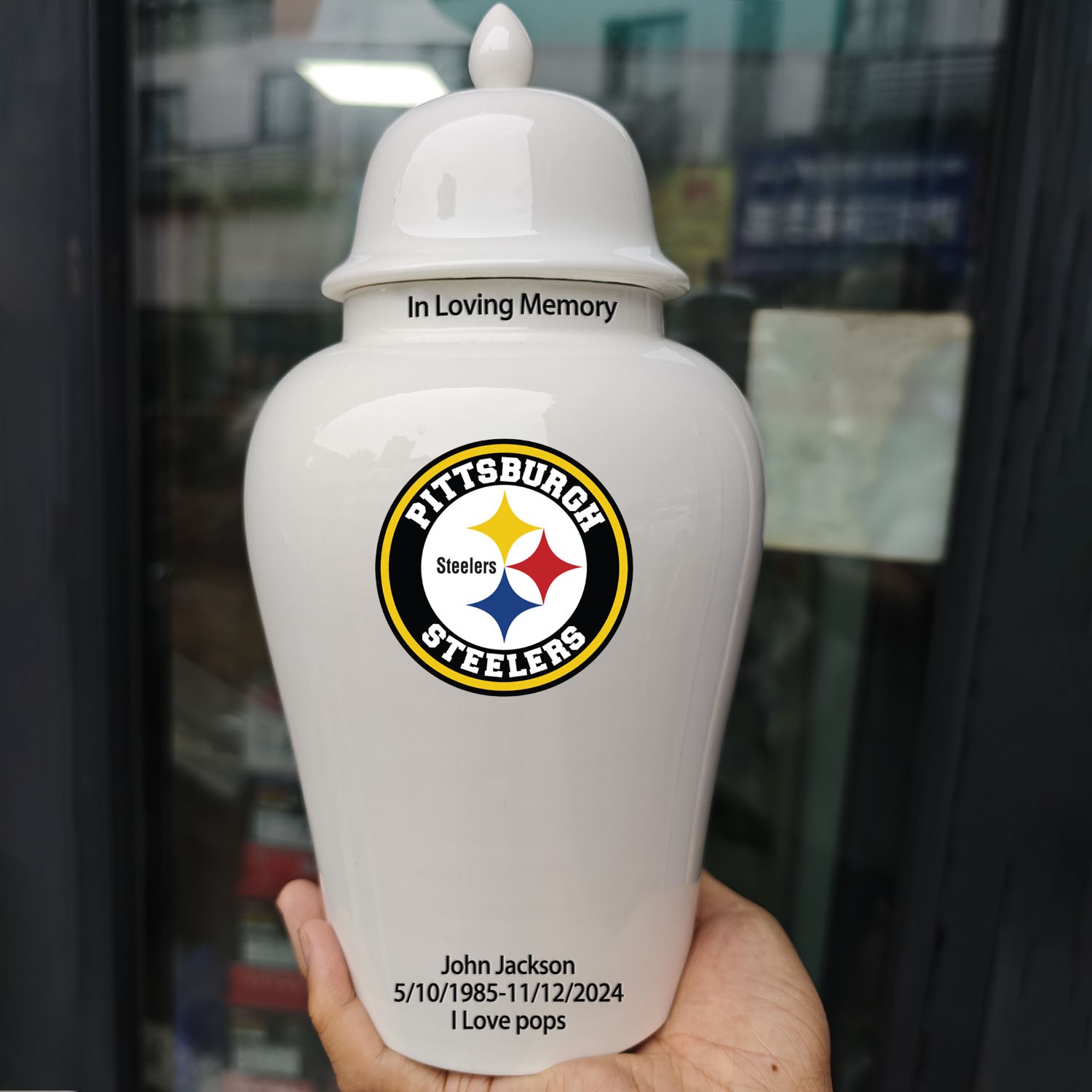 Ceramic Large Urn Pittsburgh Steelers Football Theme, Custom Text Number