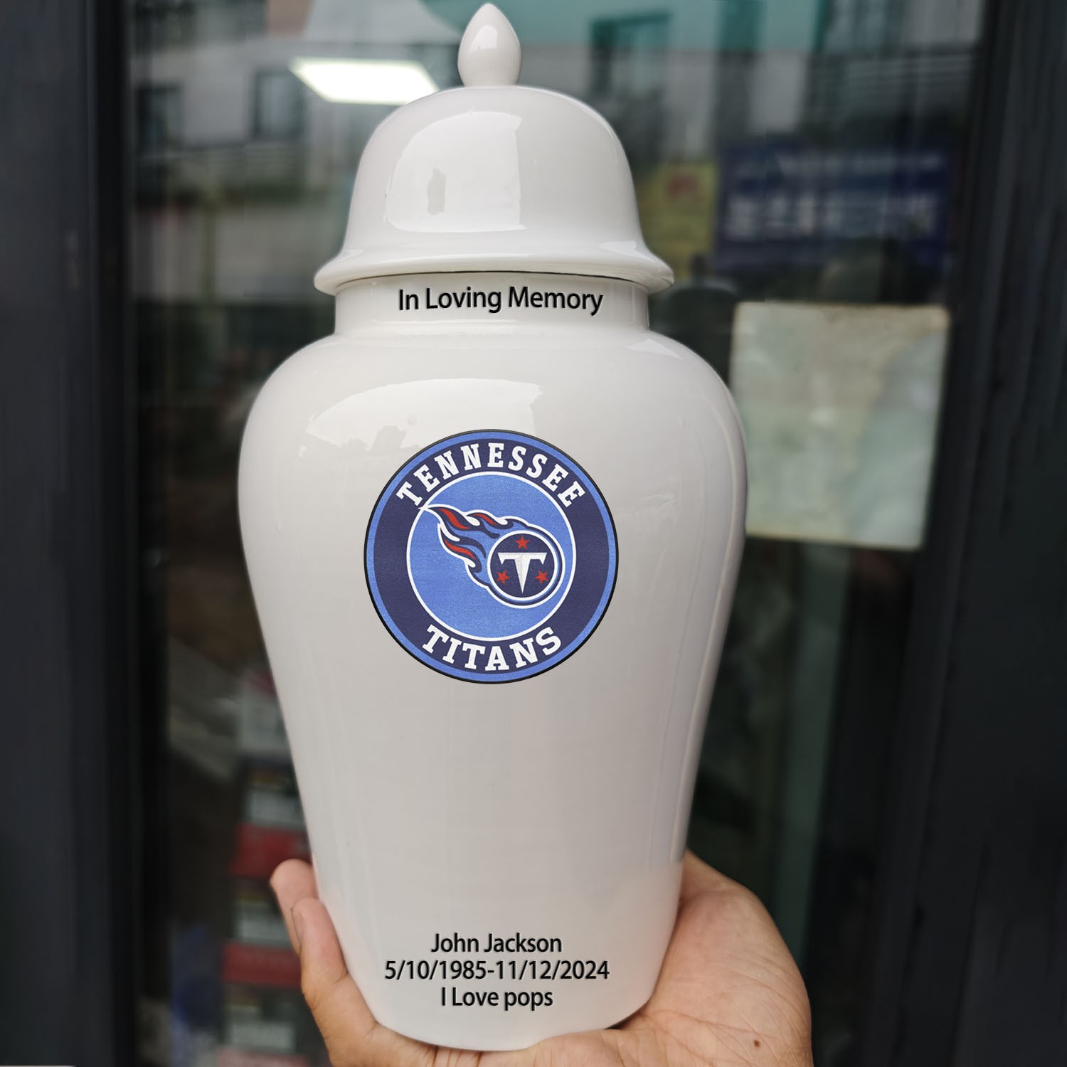 Ceramic Large Urn Tennessee Titans Football Theme, Custom Text Number