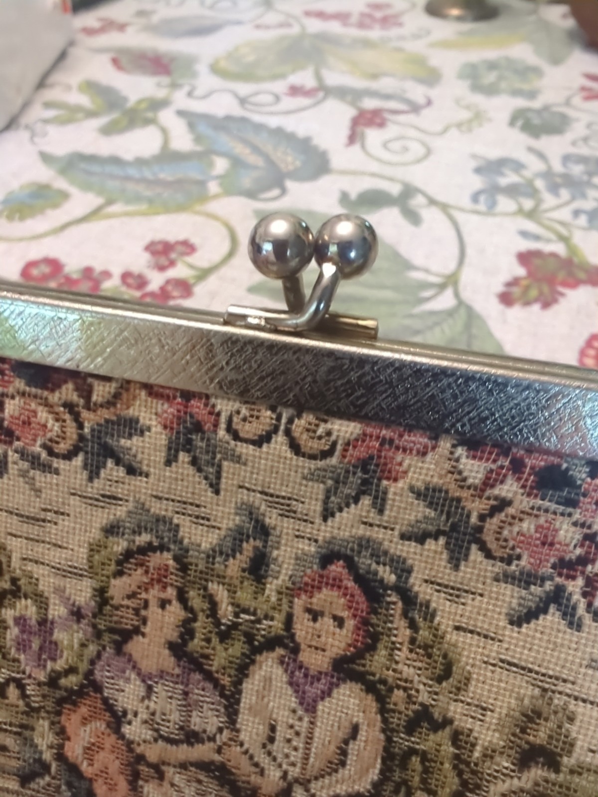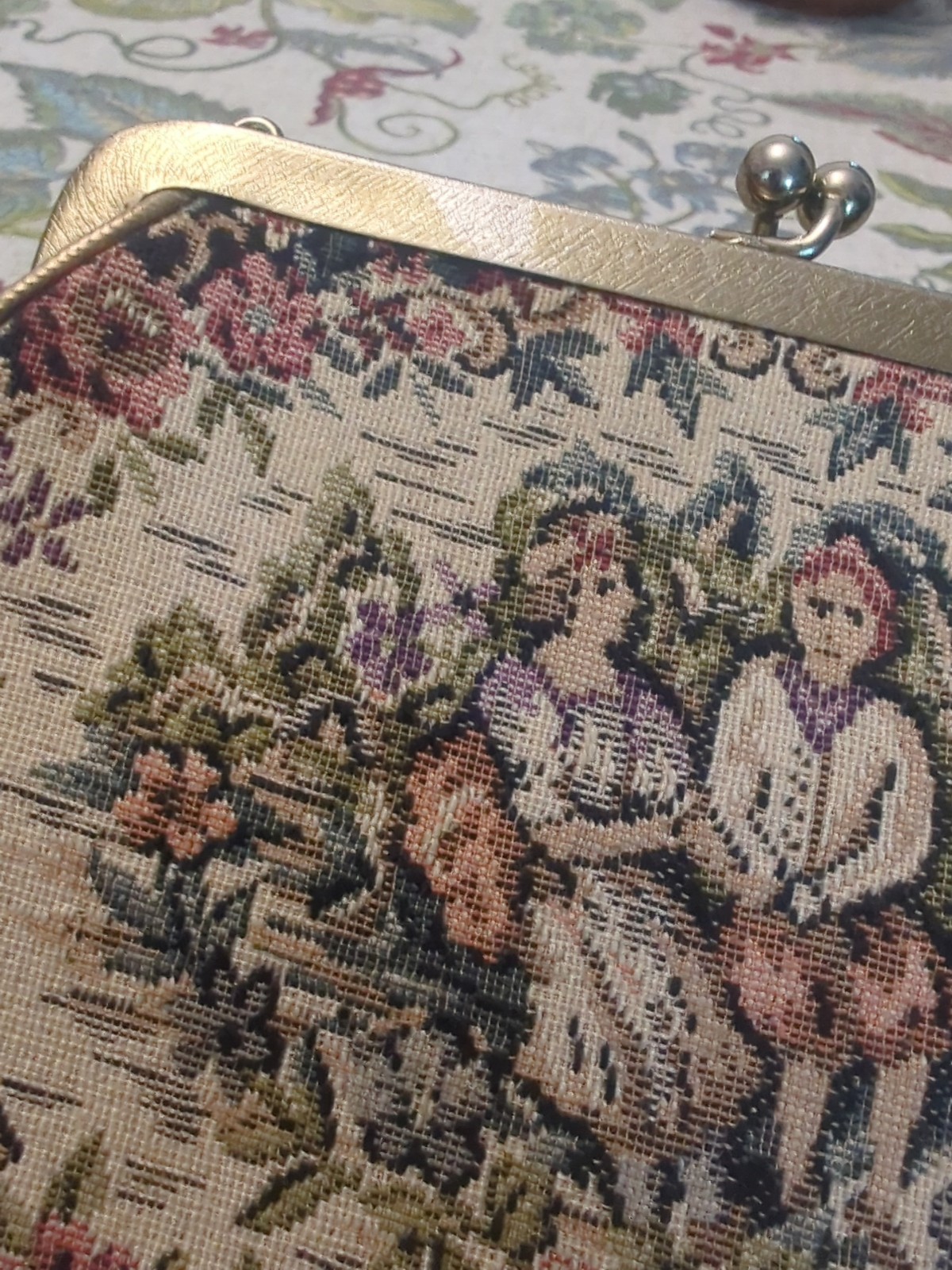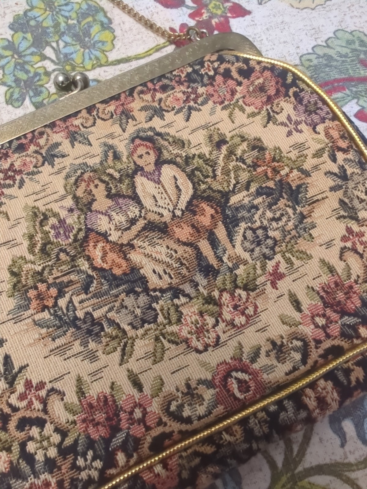 как выглядит Vintage Tapestry Needlepoint Purse Handbag Floral Gold Chain Couple фото