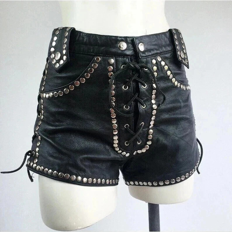 70s Vintage Black Leather Studded Lace-Up Women's Shorts Biker Gothic Festival