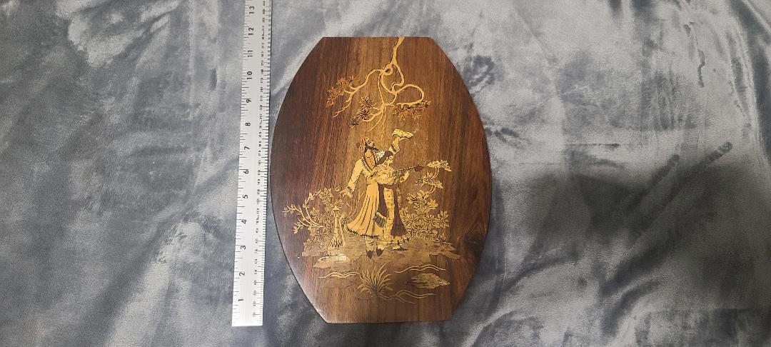 как выглядит Marquetry Wood Inlay Picture 11 3/4" x 9" Vintage Folk Art Wall India Man Woman фото
