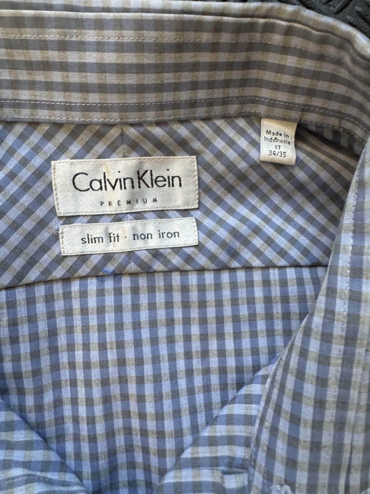 Calvin Klein Premium Men s Slim Fit Non Iron Button Up Plaid Blue Size 17 34/35