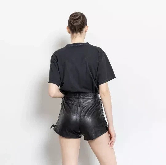 как выглядит Leather Biker Shorts - Vintage 80s Womens Black Lace-Up Rocker Shorts Custom фото