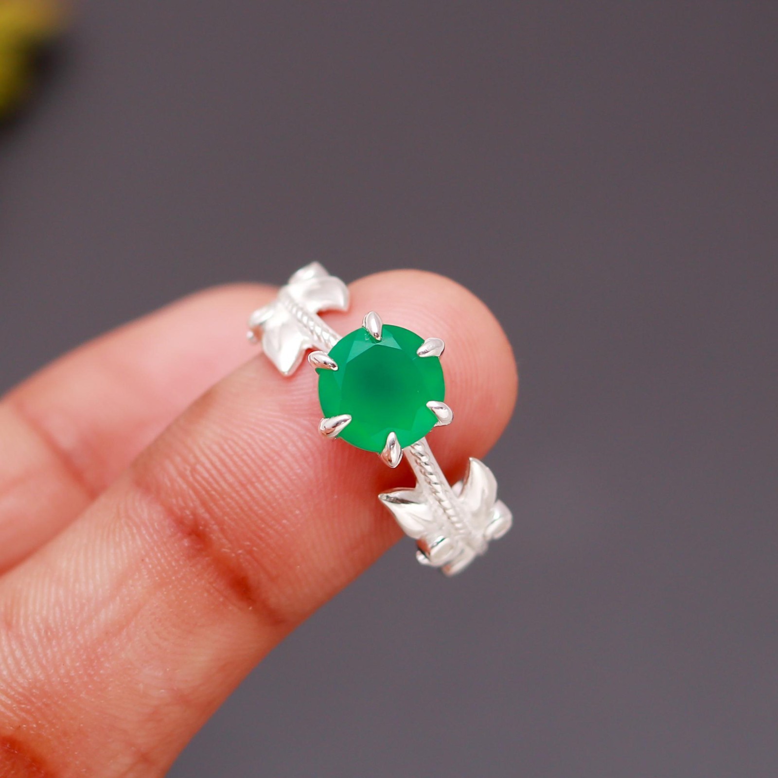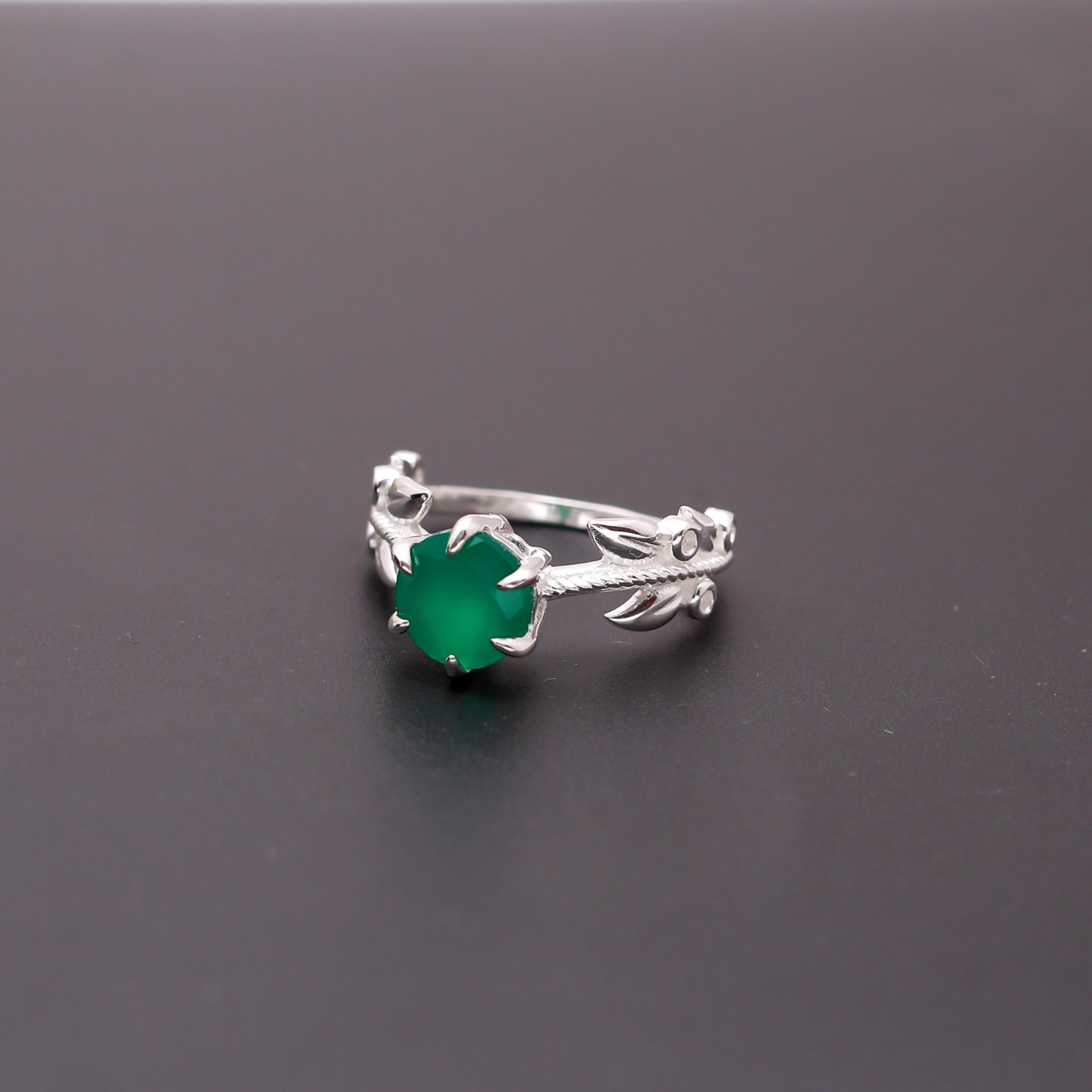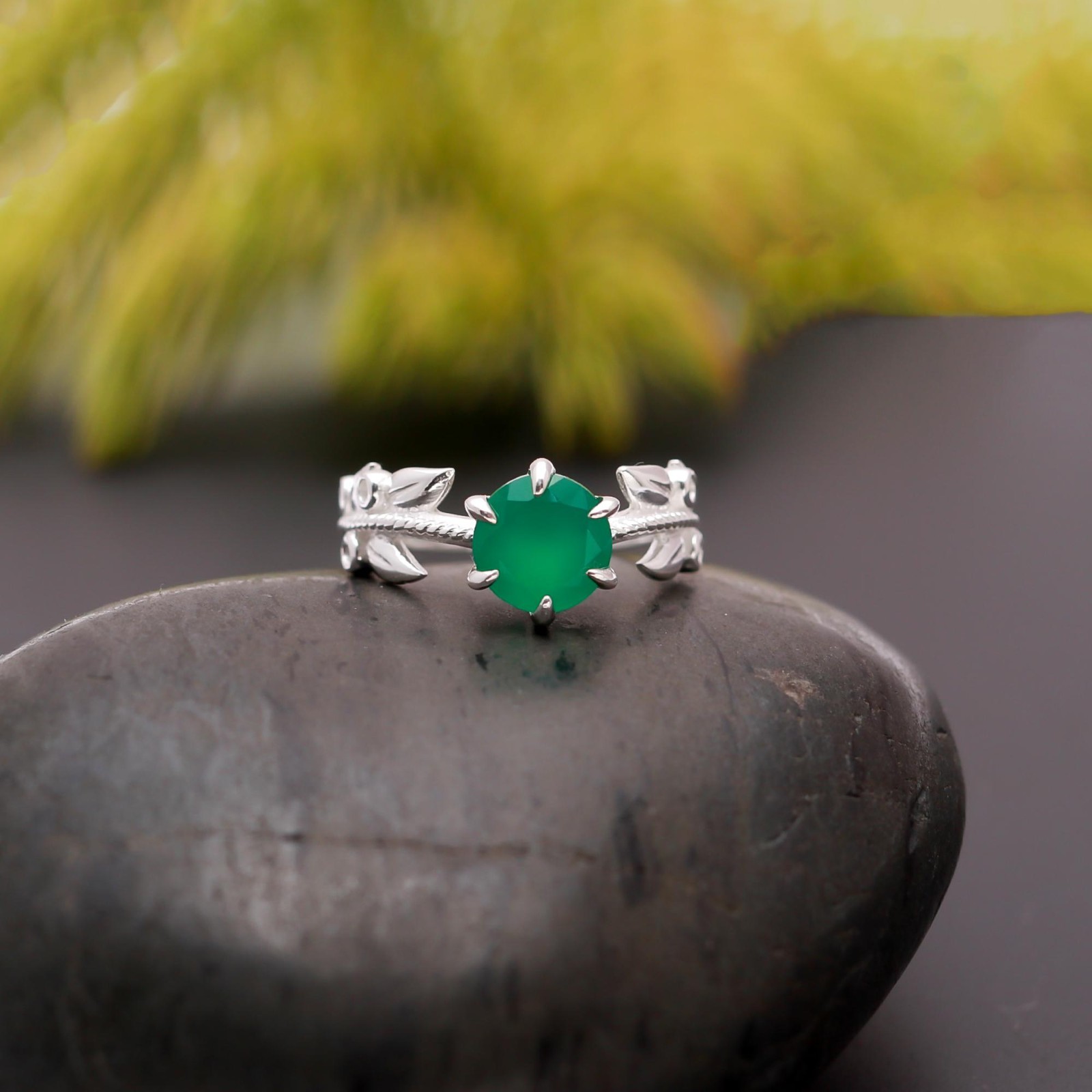 Natural Green Onyx Round Shape Leaf Ring 925 Sterling Silver Handmade Jewelry