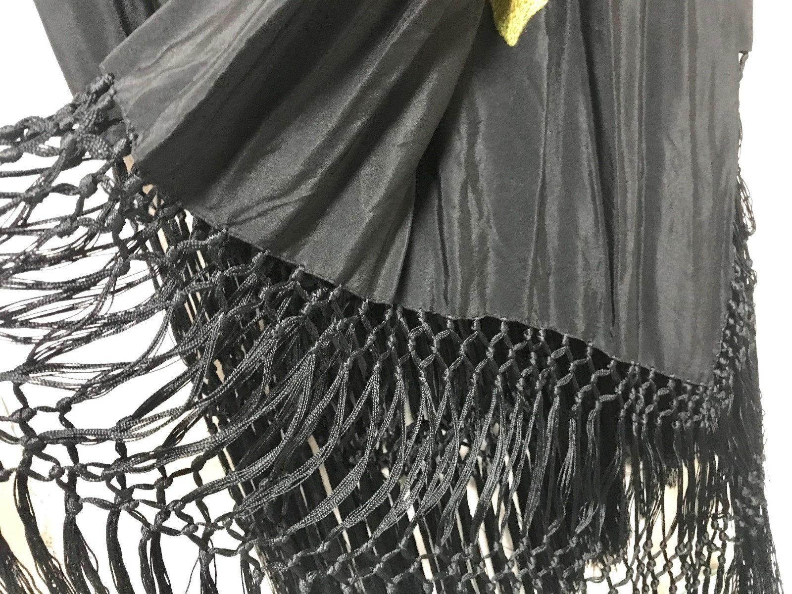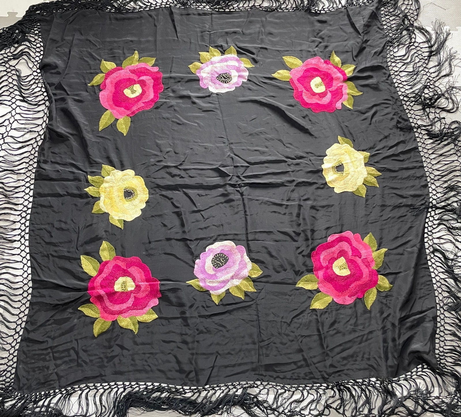 Vintage black extra large shawl with hand embroidered flowers and fringes.