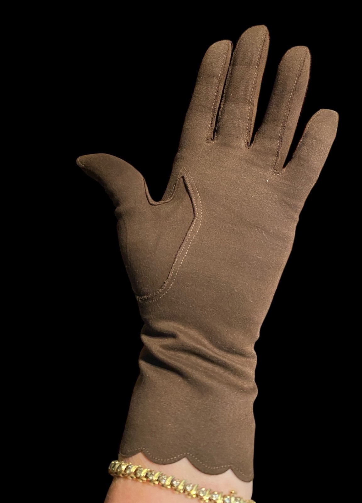 как выглядит Vintage ARIS Brown Short Wrist Length Cotton Gloves Scalloped Edge Size 6 Italy фото