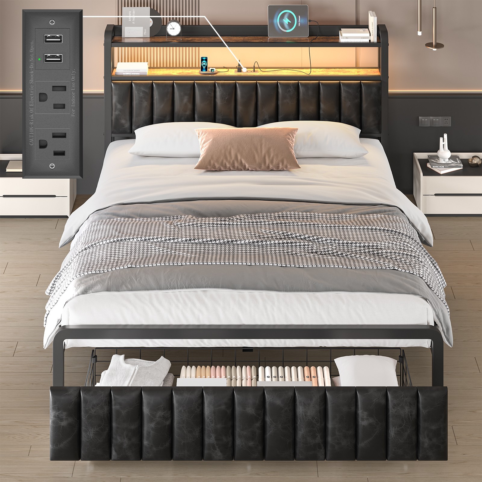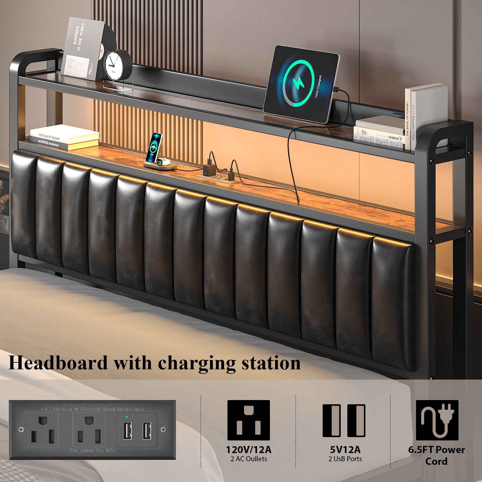 Metal Full Queen Bed Frame with Storage Drawers Charging Storage Headboard, LED