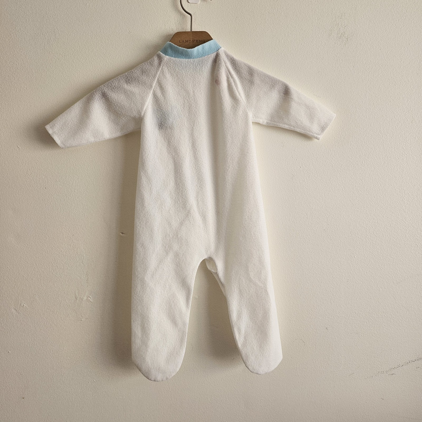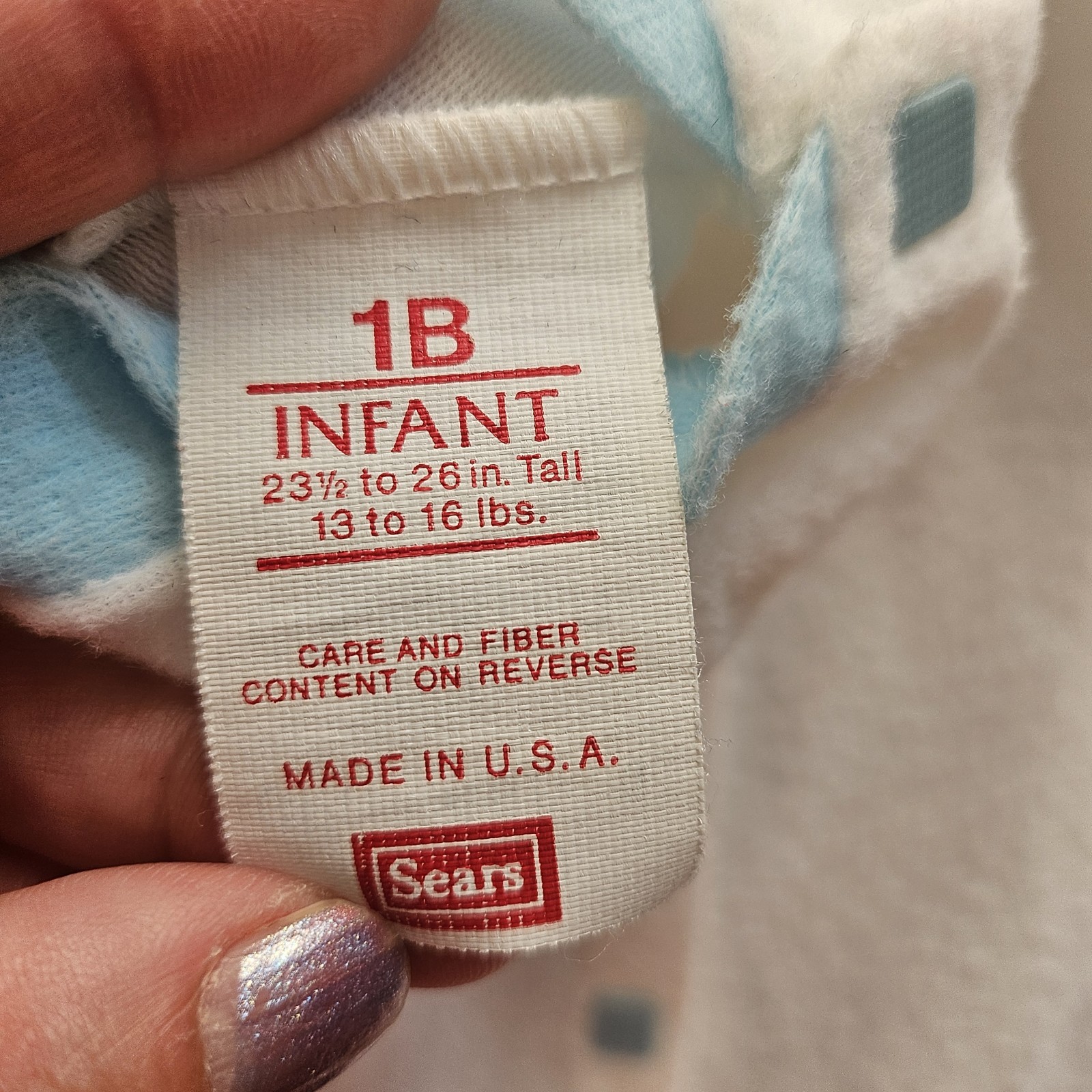 Vintage Sears White blue baby sleeper with train graphic. Made in USA. Newborn.