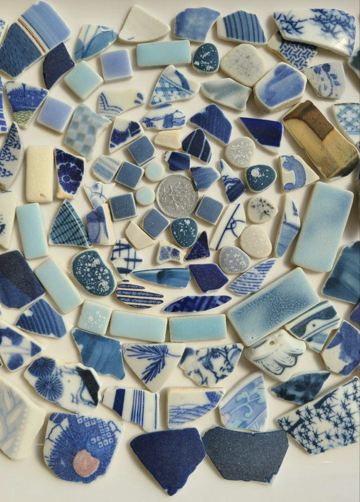 как выглядит Japanese sea glass Surf-Tumbled Beach Glass pottery Various sizes blue фото