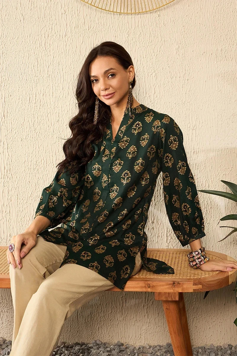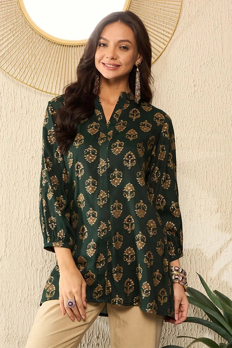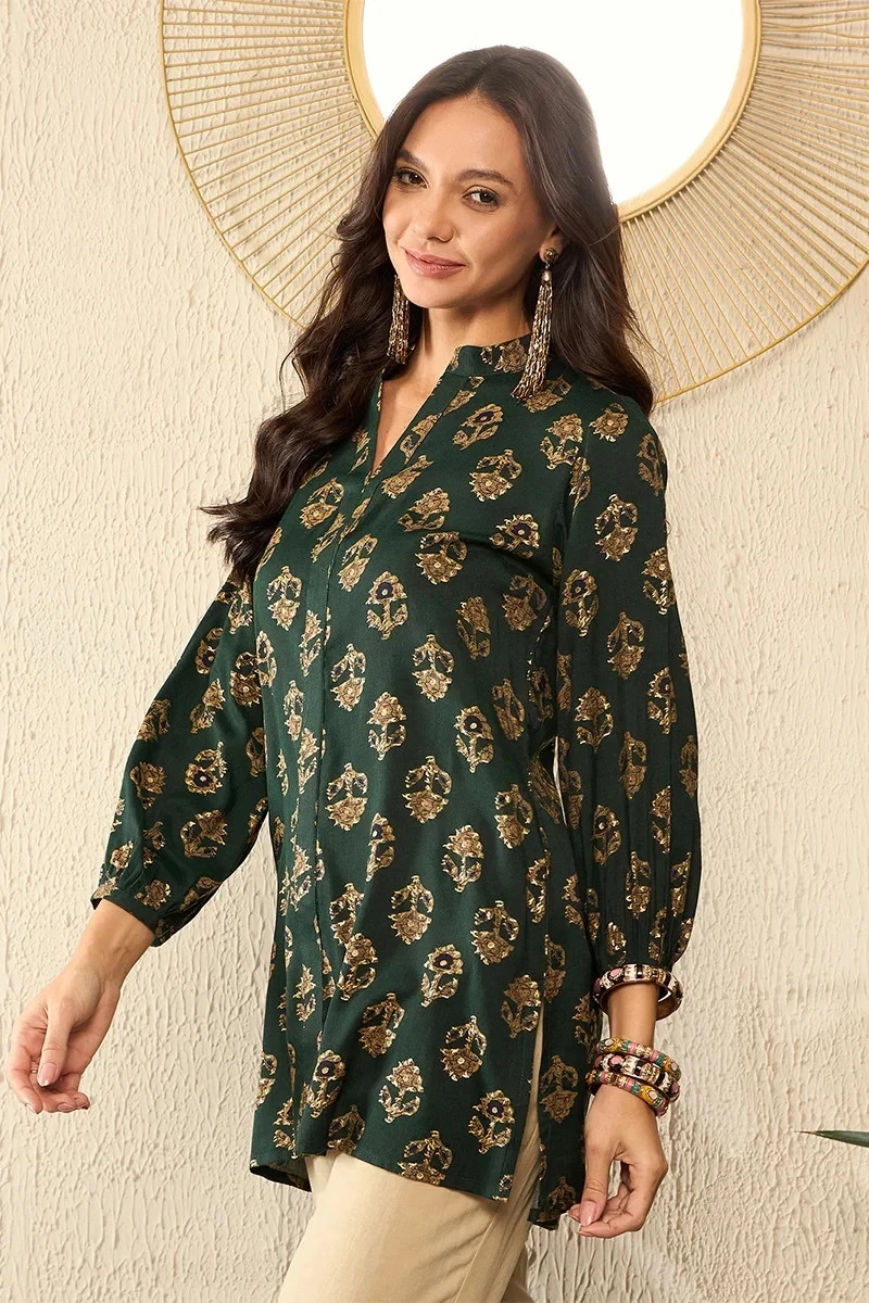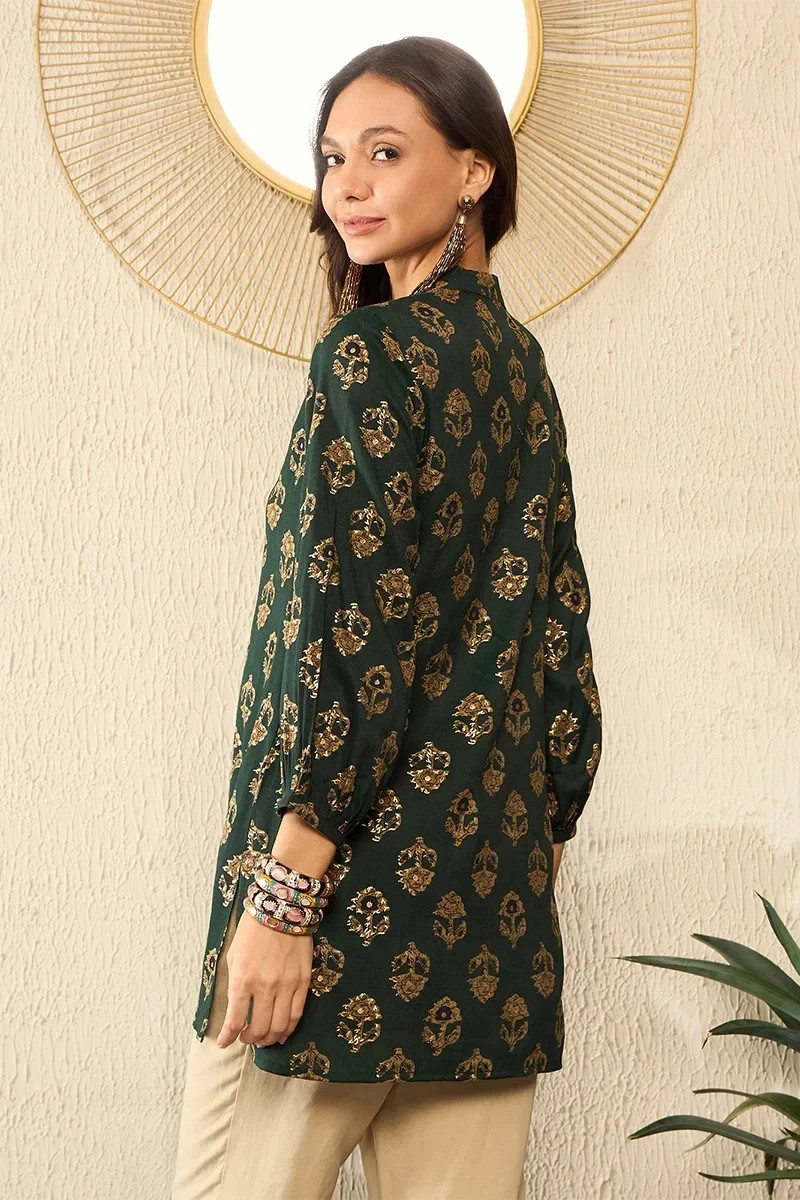 Indian Women BEAUTIFUL Green Cotton Floral Printed Top Tunic Kurta Kurti Dress