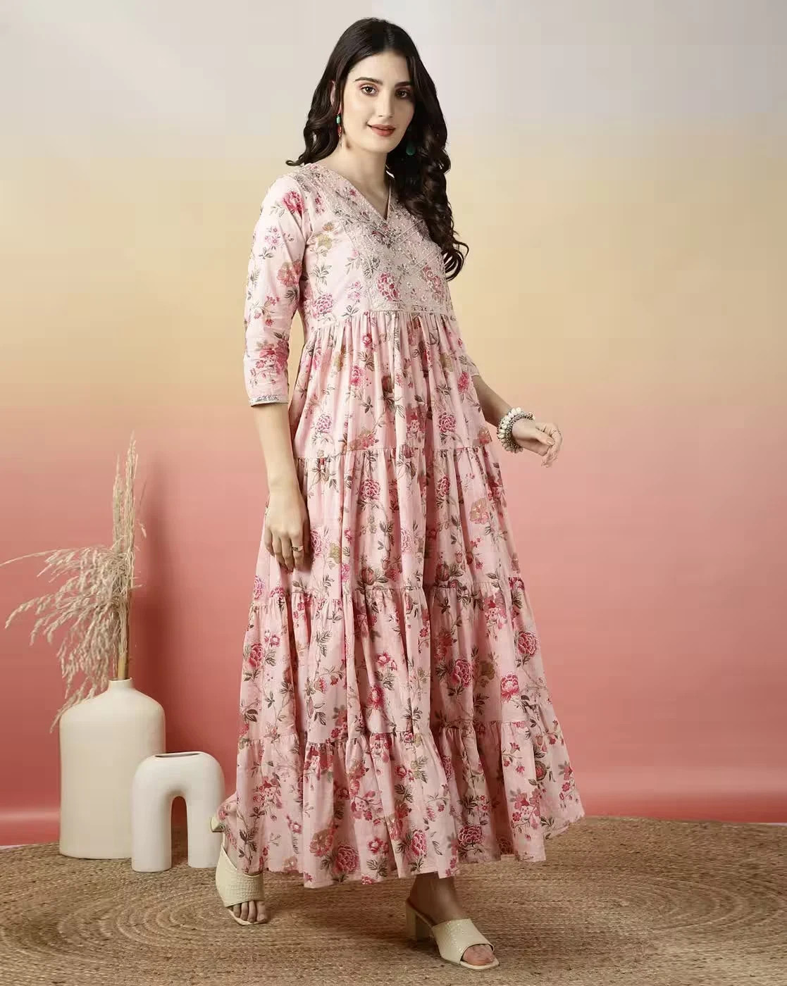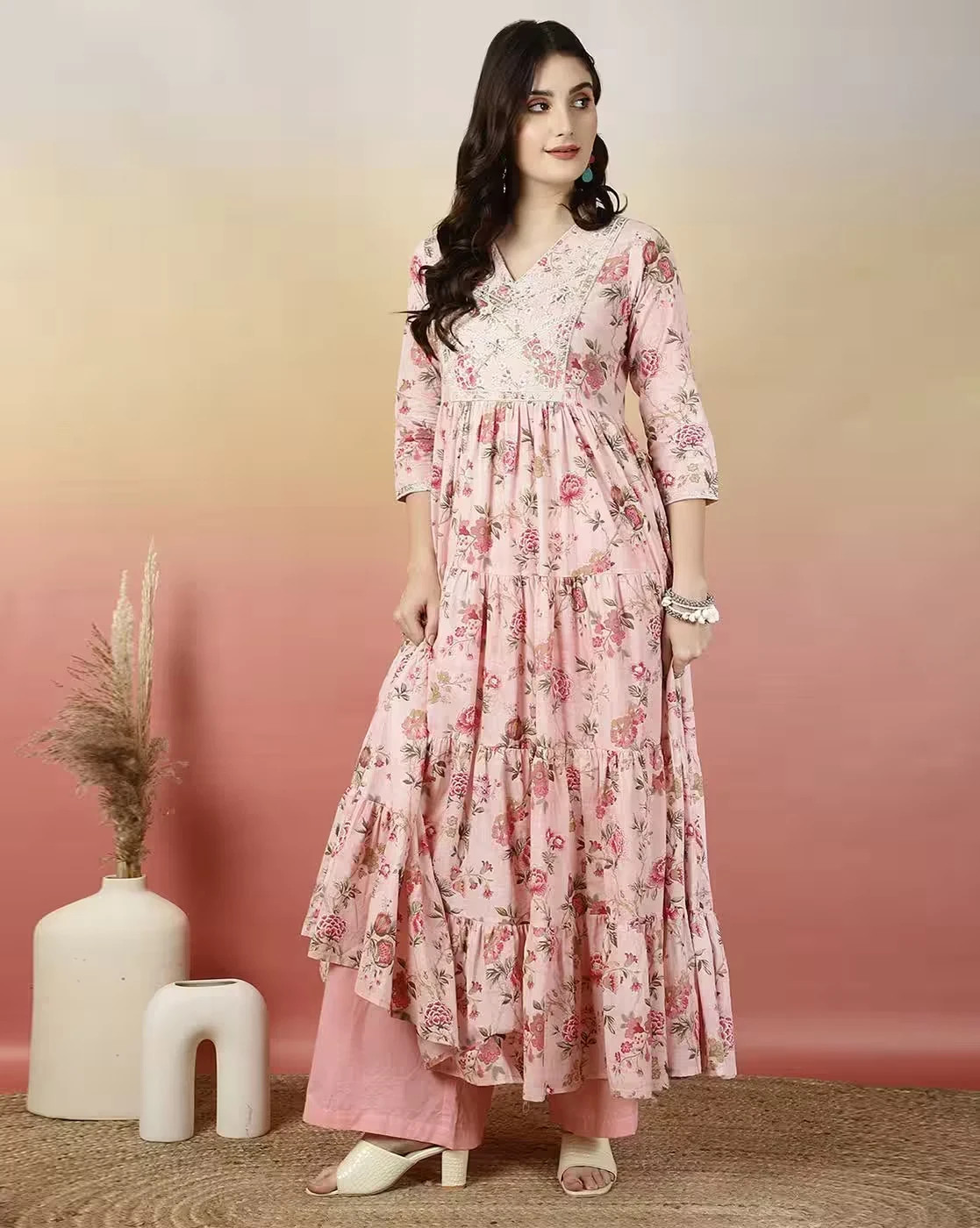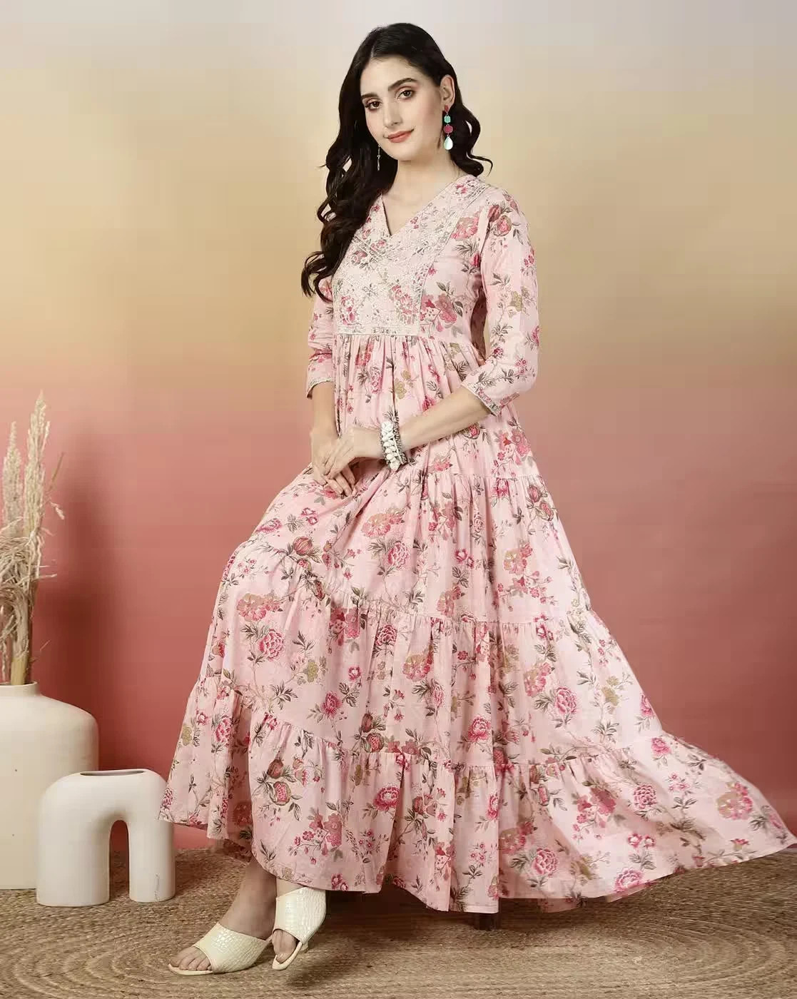 как выглядит Indian Women Cotton Pink Floral Printed Anarkali Flared Kurta Kurti Long Dress фото