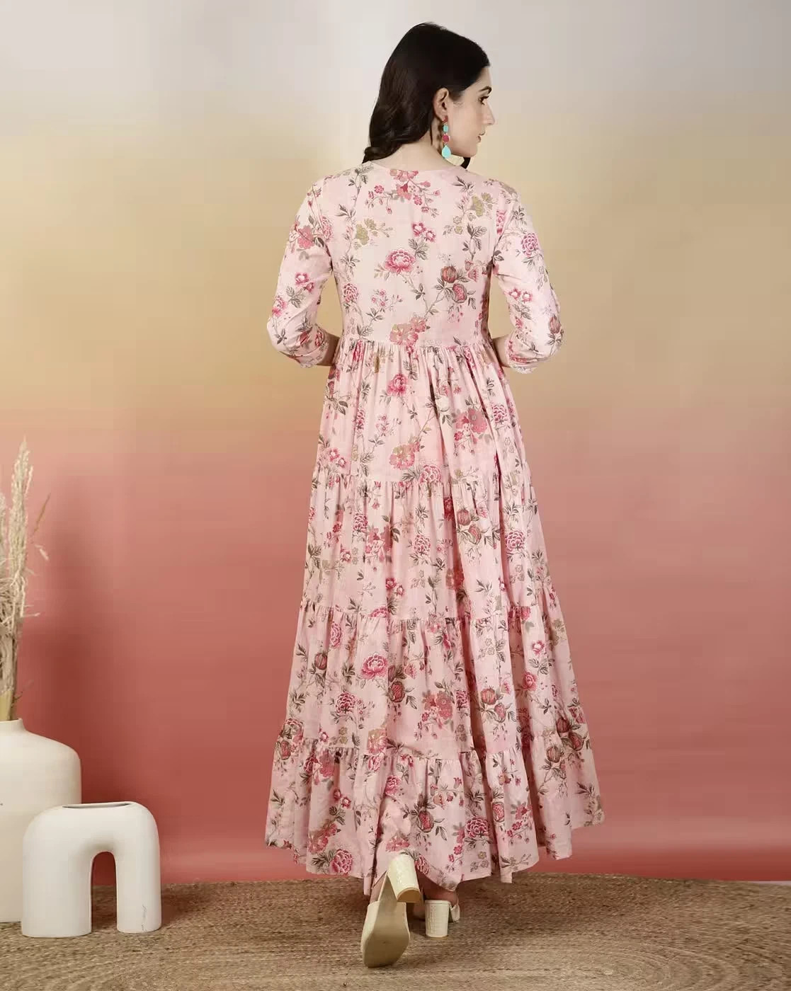 Indian Women Cotton Pink Floral Printed Anarkali Flared Kurta Kurti Long Dress