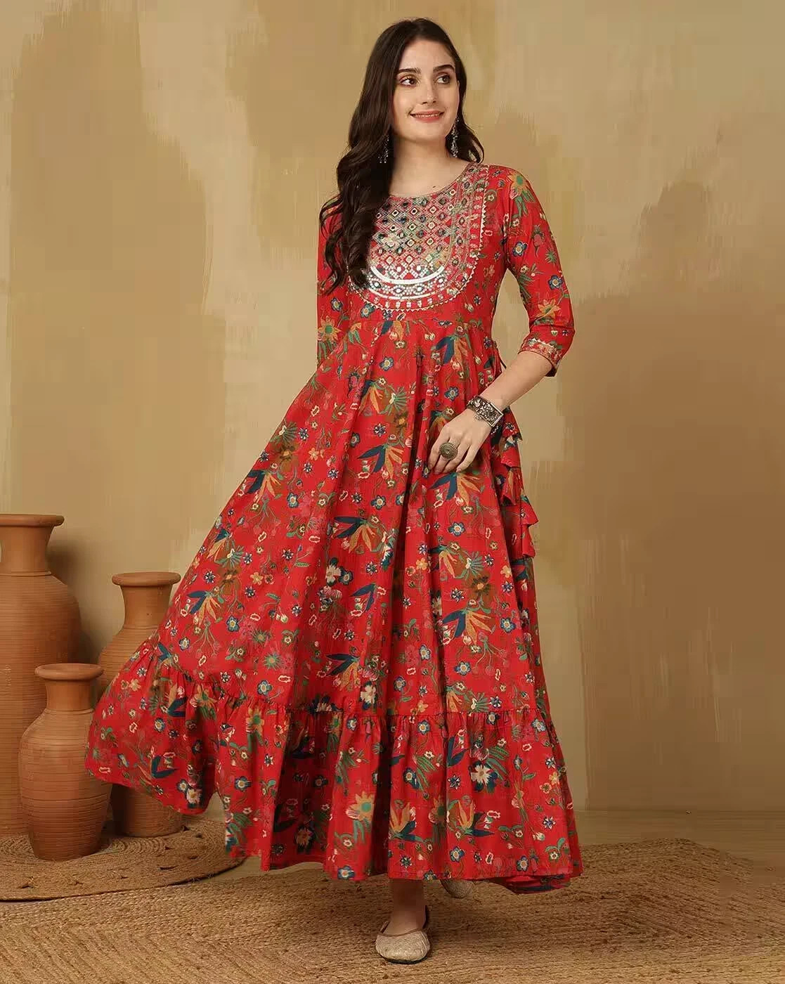 как выглядит Indian Women Cotton Red Floral Printed Anarkali Flared Kurta Kurti Long Dress фото