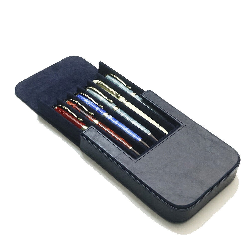 • Leather 6 Slots Hard Fountain Pen Case Stationery Storage Box Organizer Blue