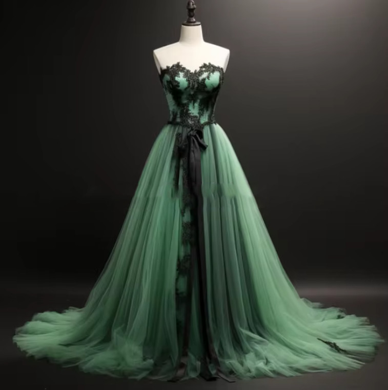 Green Tulle and Black Lace Trim Appliqued Full Wedding Dresses lace-up Formal