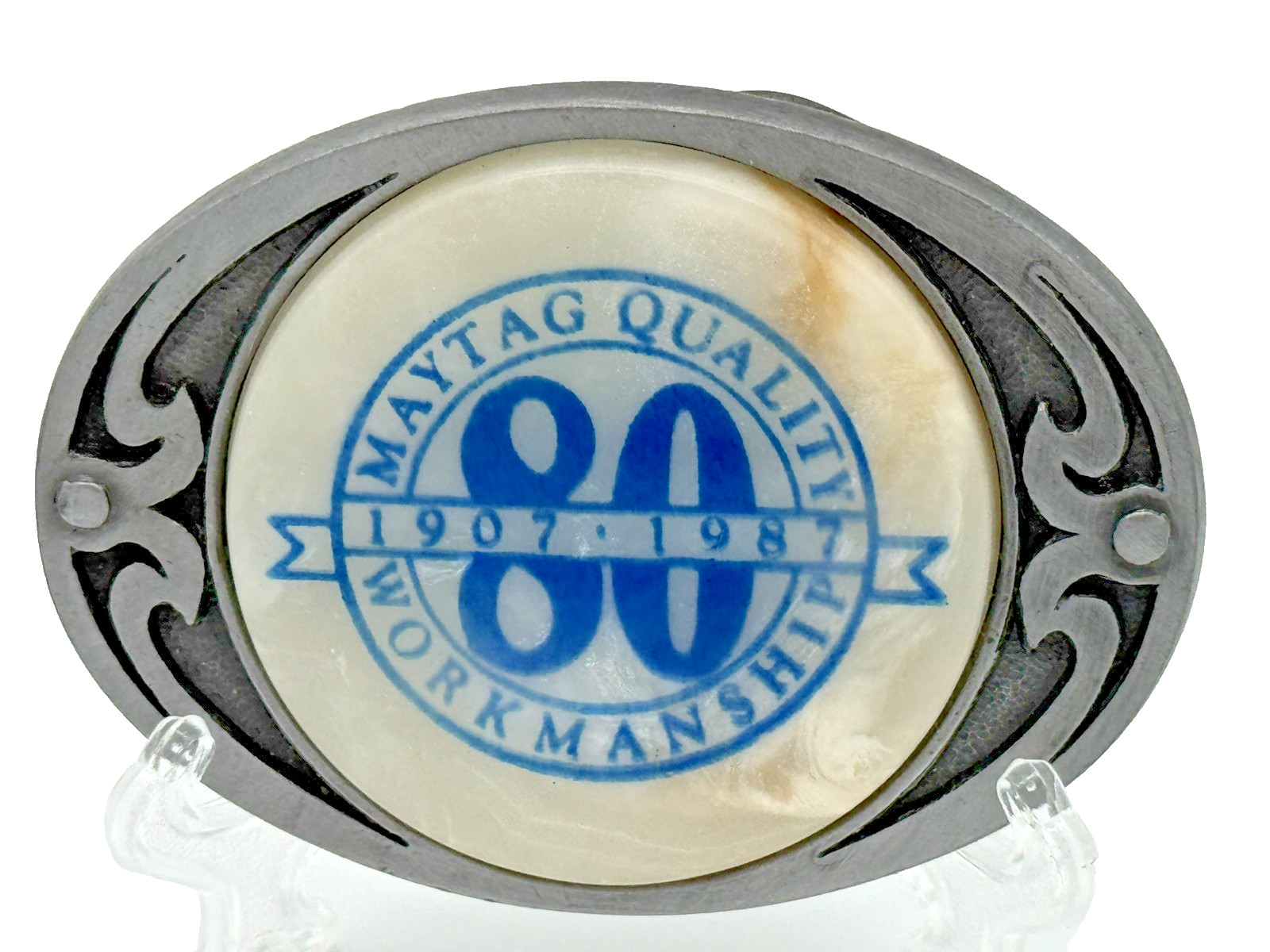 Maytag 1907-1987 Quality Workmanship Belt Buckle Metal Polished Stone
