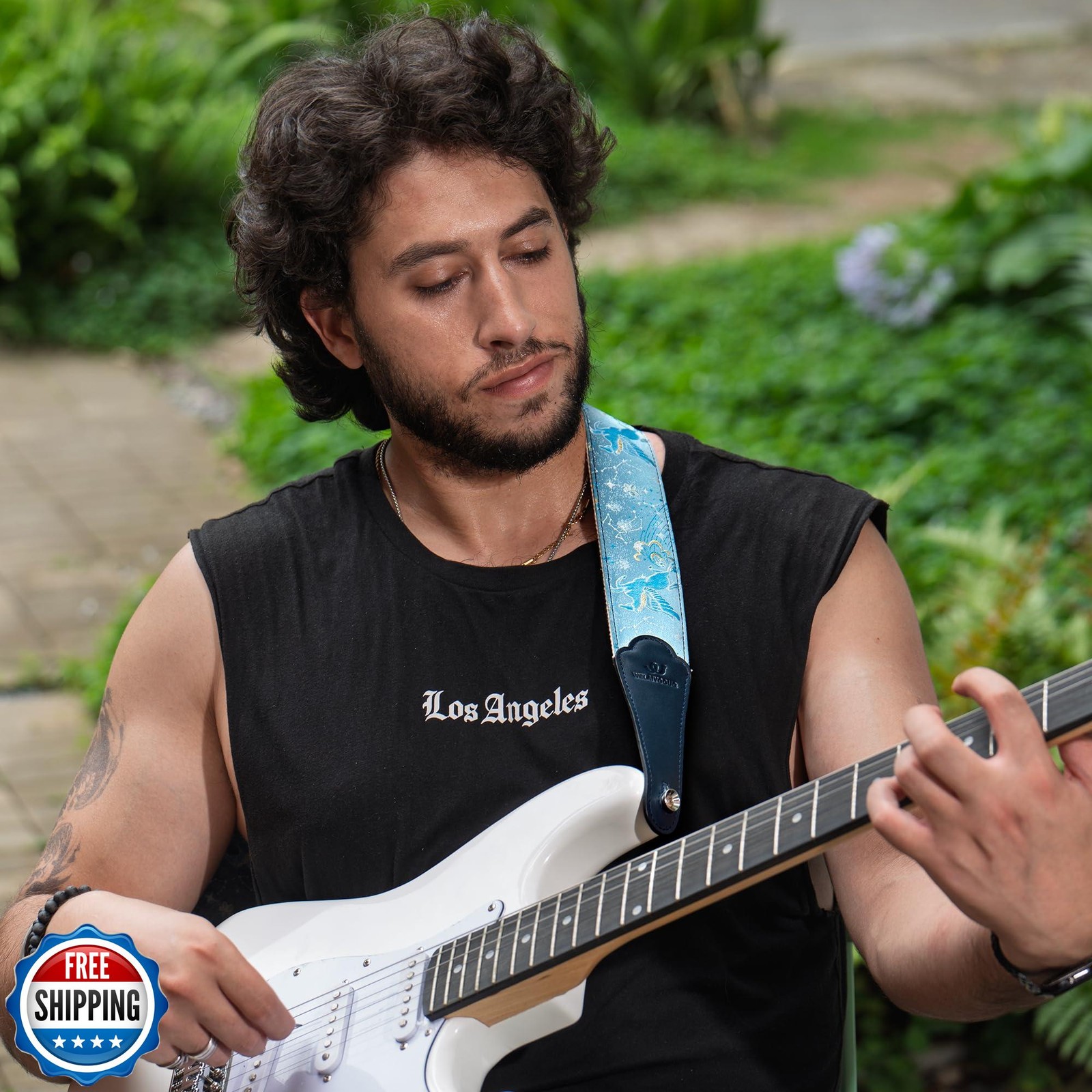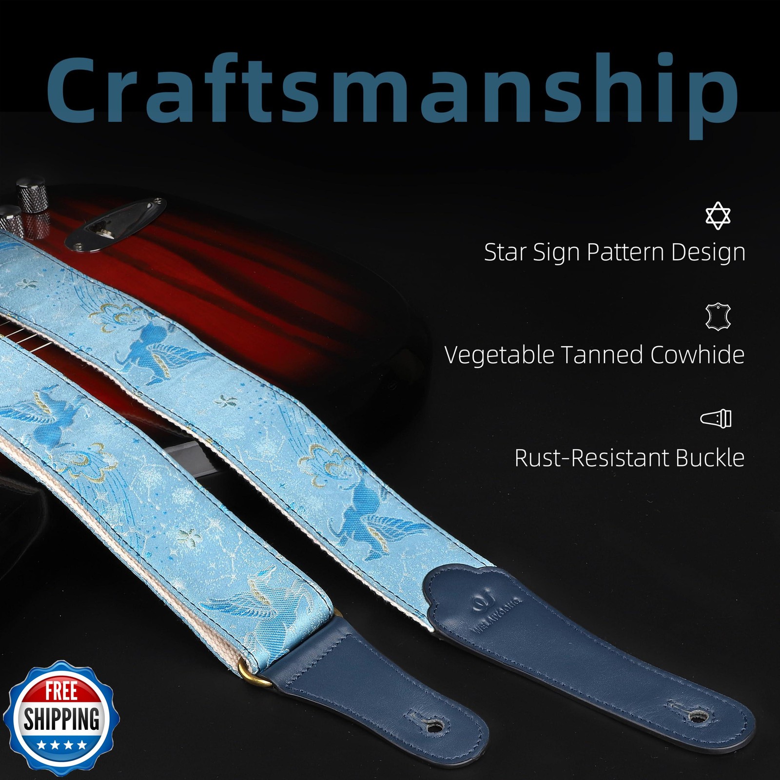 WELAIYOOUQ Guitar Strap, embroidery Jacquard and Genuine Leather Guitar Strap