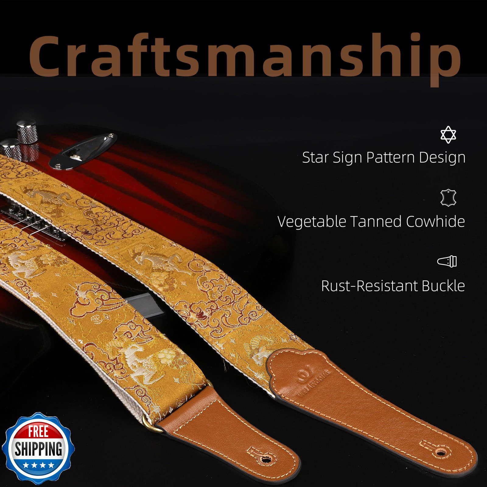 WELAIYOOUQ Guitar Strap, embroidery Jacquard and Genuine Leather Guitar Strap