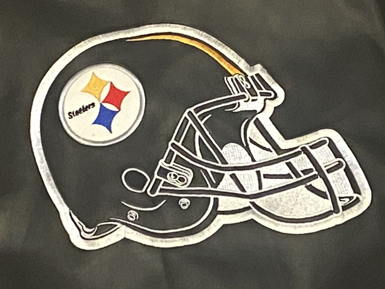 как выглядит PITTSBURGH STEELERS Mens Faux Leather Bomber Style Jacket Sz XL Black Yellow фото