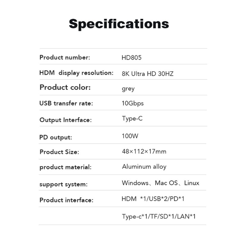 TypeC HUB Docking Station 2xUSB HDMI-compatible-8K Support PD100W Rj45 TF