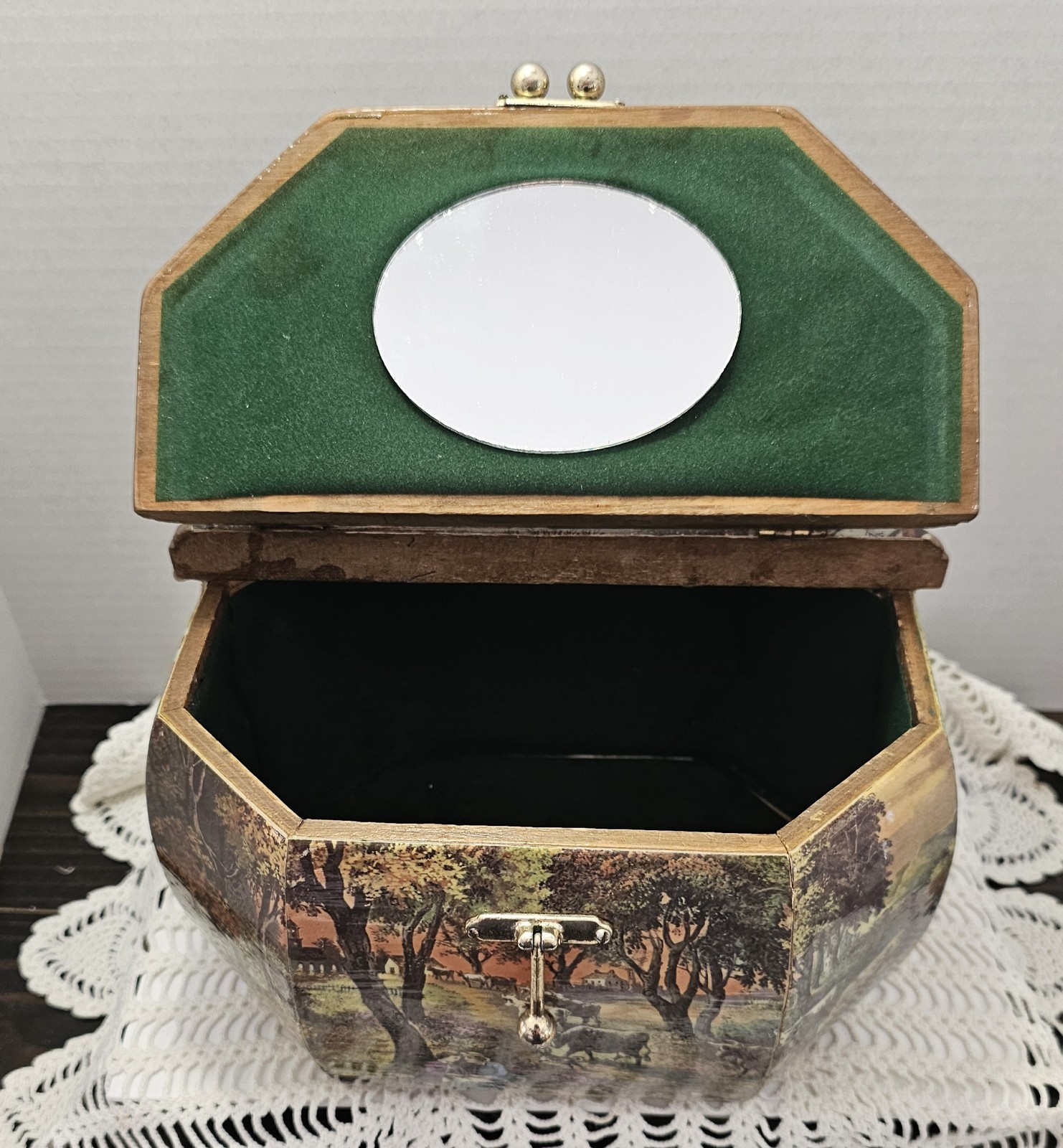 как выглядит Vintage Anton Pieck Wooden Octagon Box Purse countryside 70