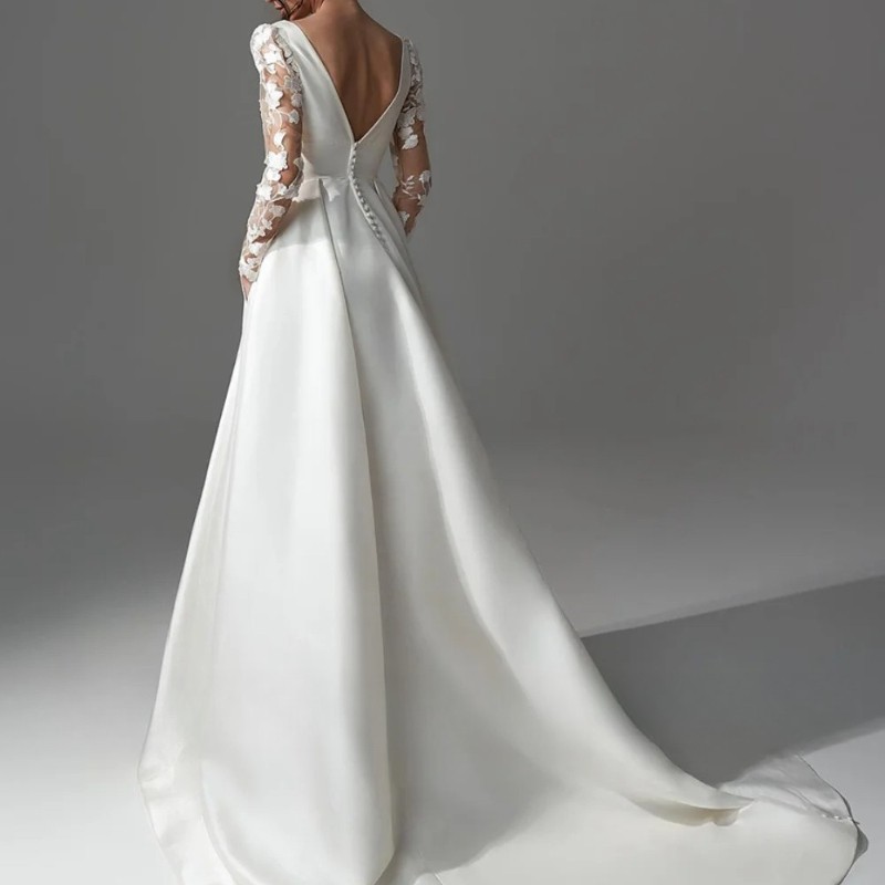 как выглядит Satin Wedding Dress Lace Sleeves V Neck High Slit Sweep Train A Line Bride Gown фото